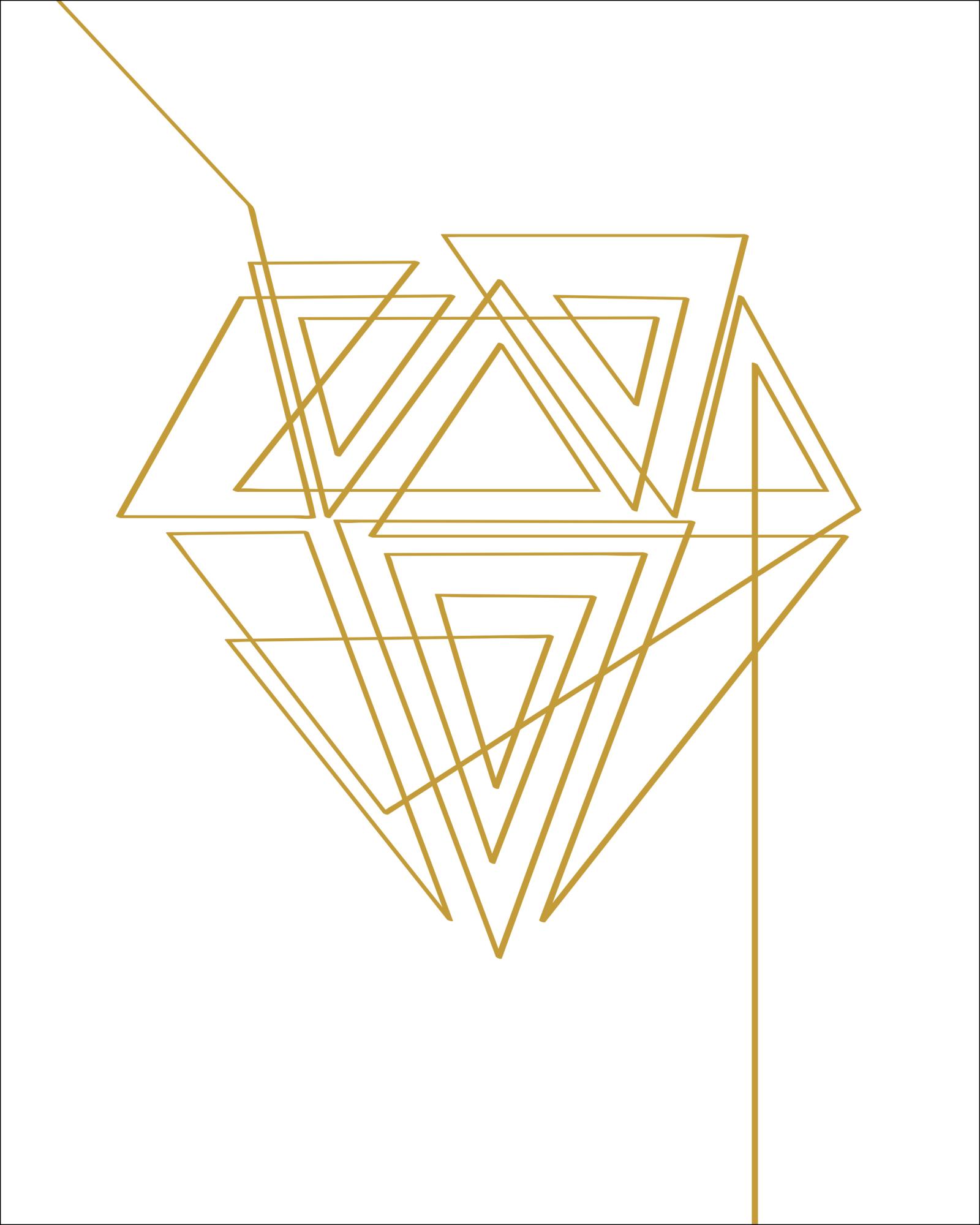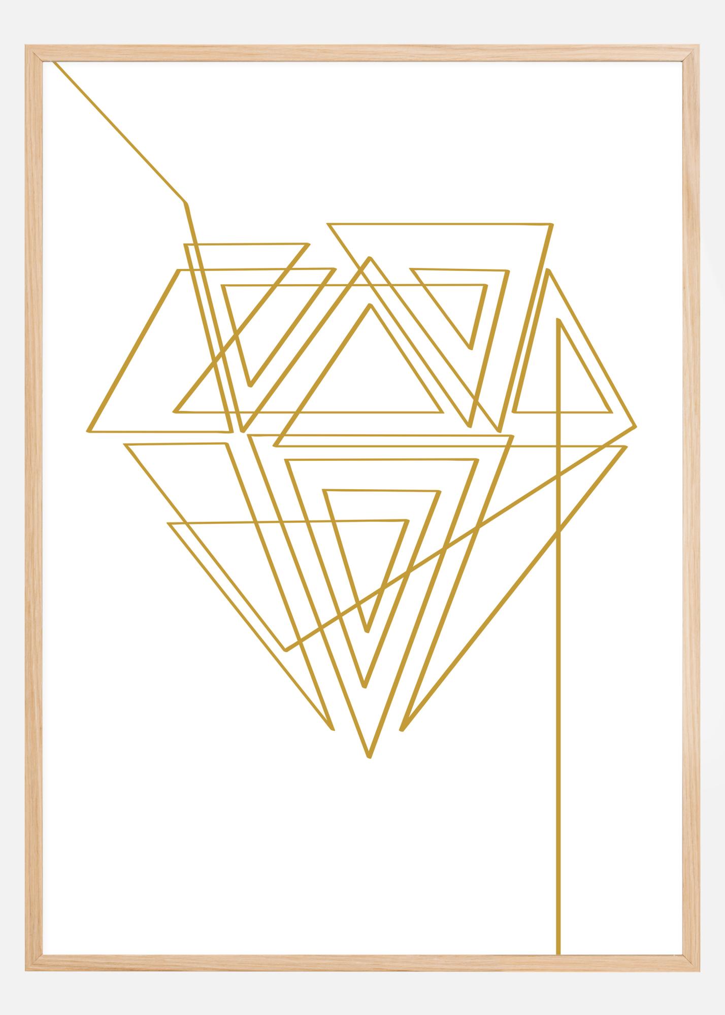 Абстрактен постер с диамант от златни геометрични линии. Този диамант е сложно изграден от различни триъгълни форми в дълга, непрекъсната линия. Следвайте линията и вижте дали можете да разгадаете целия модел. Произведението е направено на бял фон, така че се окачва най-добре на кремава или златиста стена.