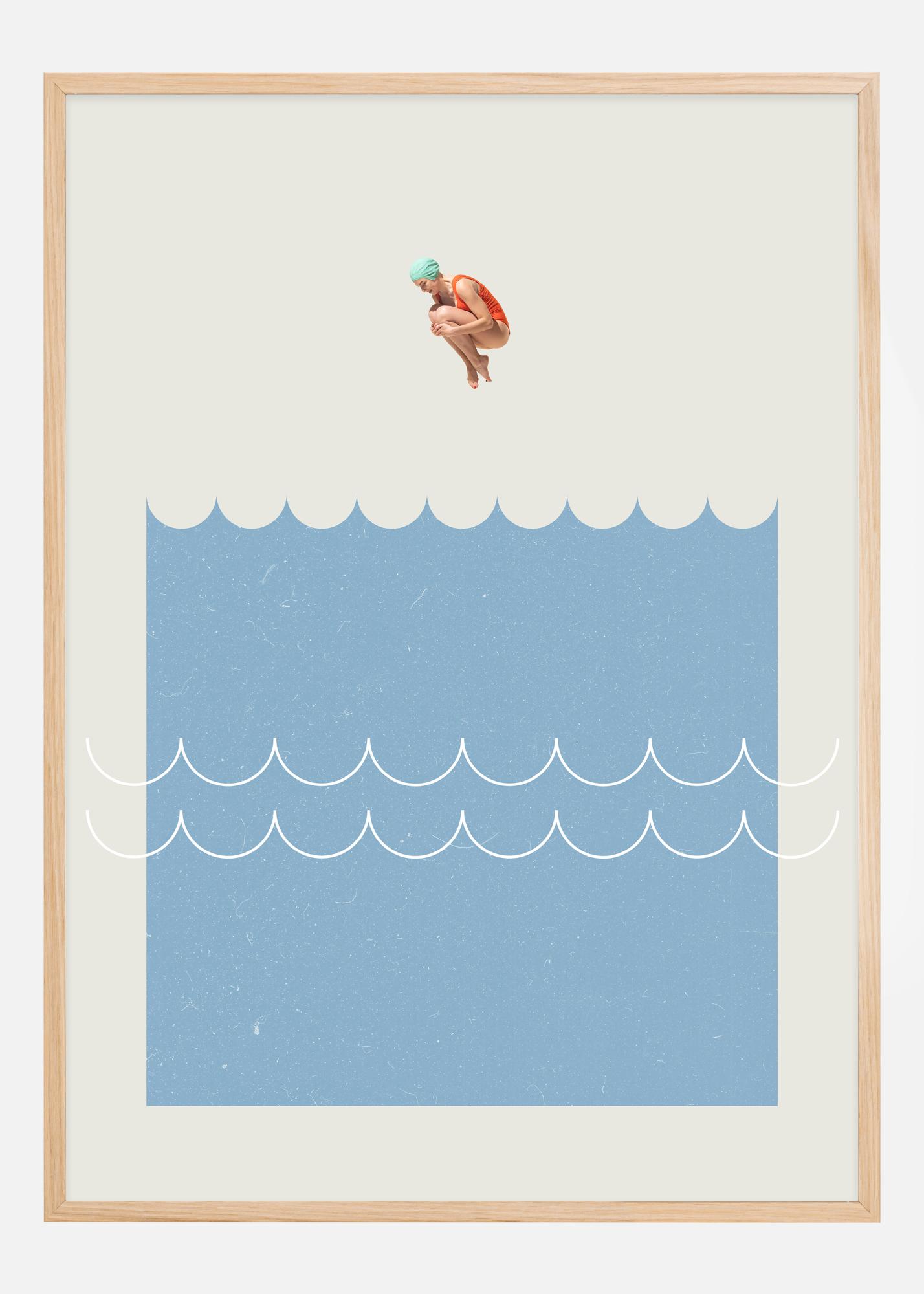 Този постер е игриво тълкуване на летен плясък, където малка фигура в бански и плувна шапка се вижда в свободно падане към стилизирана илюстрация на вълни. Минималистичният дизайн комбинира реалността с абстракцията, което дава креативна и освежаваща перспектива на класическата тема за лятото и радостта от къпането.