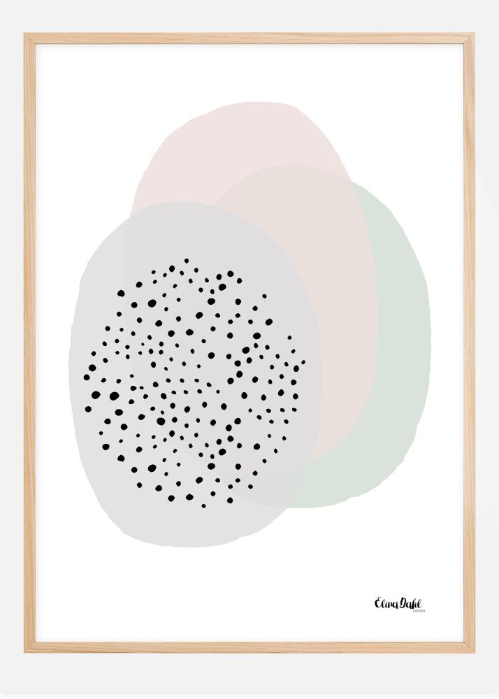 Художествен постер с необичайно оформено петно с три различни цвята, единият от които съдържа редица малки черни точки. Синята, розовата и зелената част от припокриващите се форми добавят приятен щрих към тази абстрактна картина. Нека те изпъкнат повече, като изберете стена в подходящ цвят, на която да закачите това произведение.