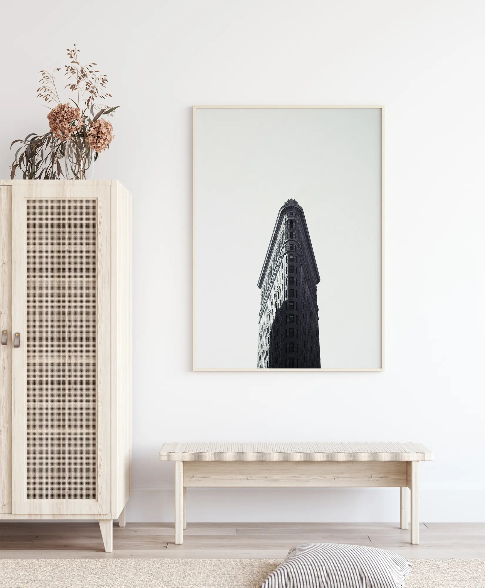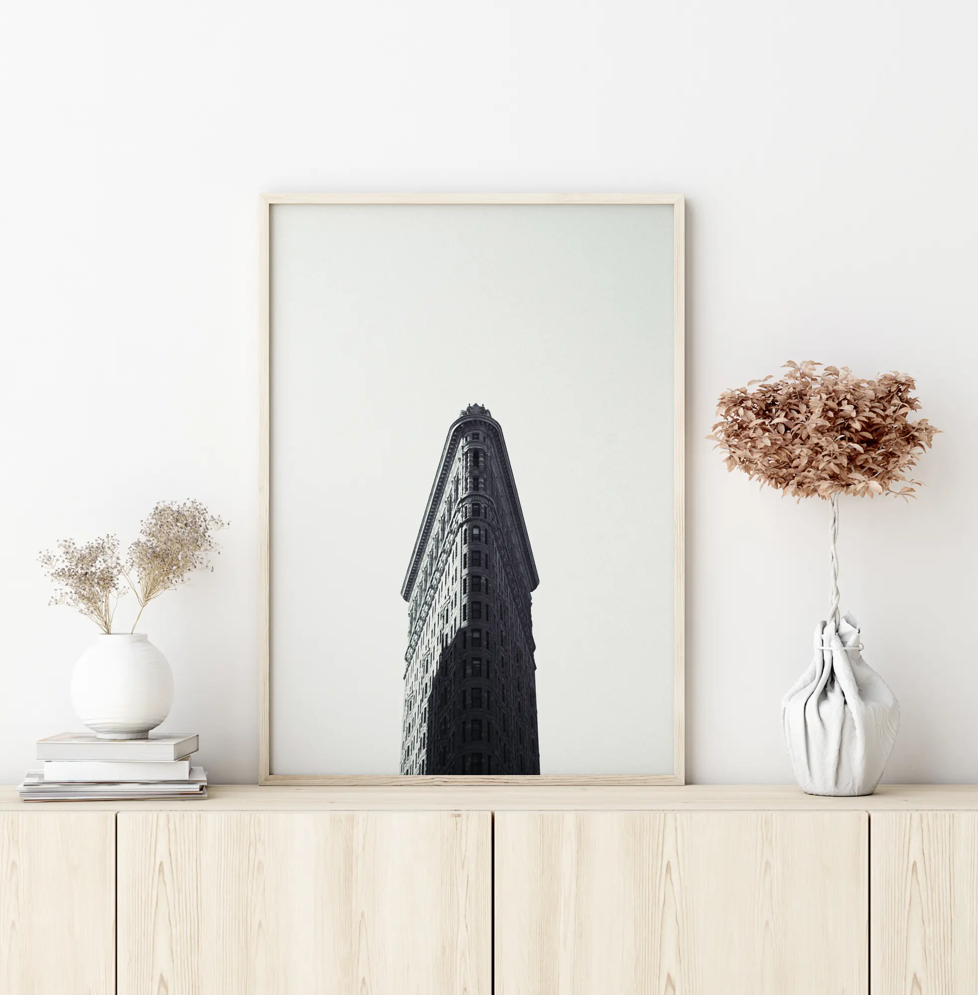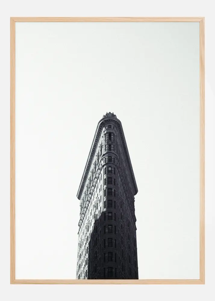 Архитектурен постер, който показва предния ъгъл на стар жилищен блок. Предната част на сградата изглежда като нос на кораб, който е в силен контраст с бялото небе. Триъгълната форма привлича погледа и го води нагоре по сградата. Окачете това произведение на стена с блоков цвят, за да създадете артистична атмосфера.