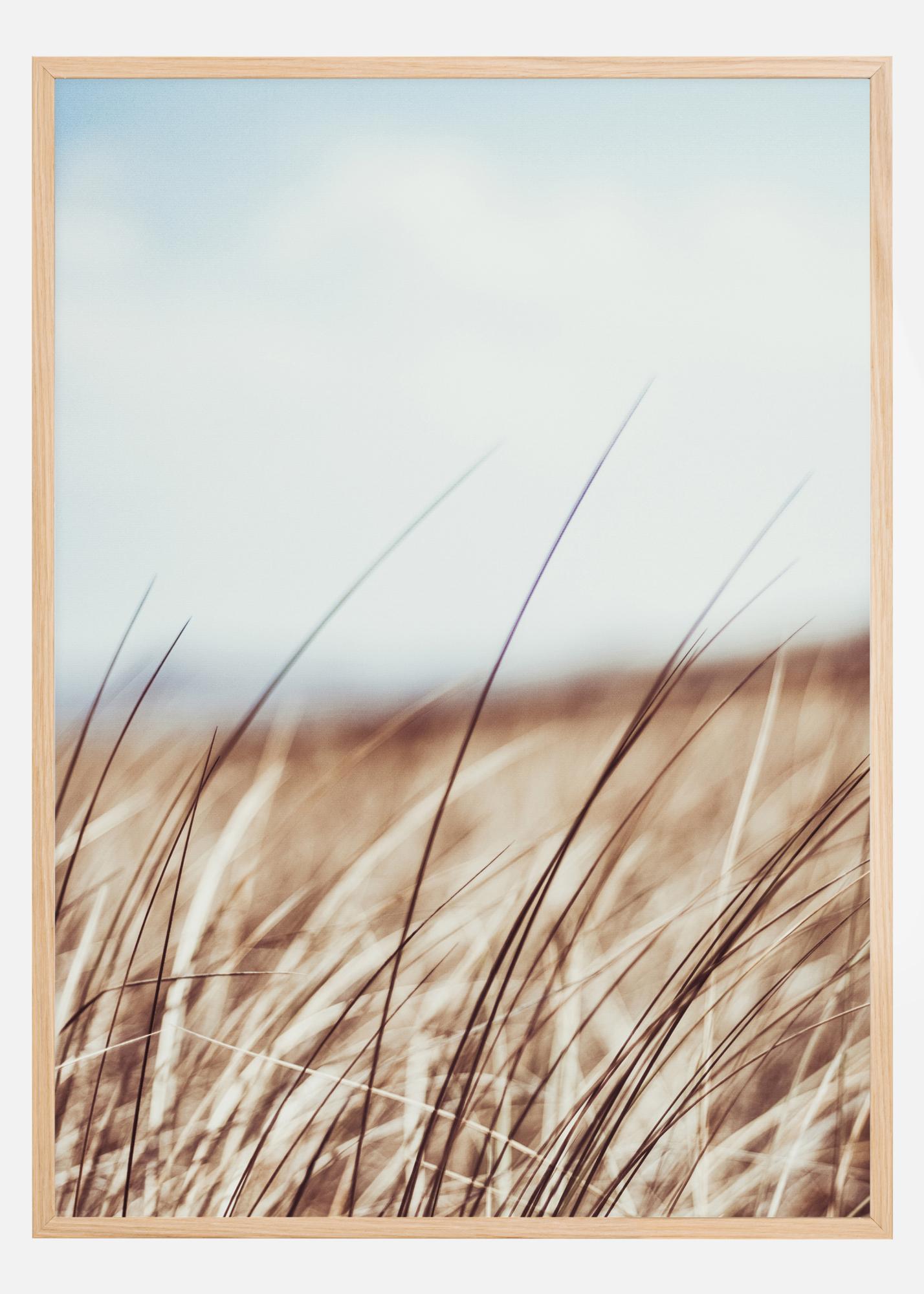 Един обикновен постер с трева, която се люлее на вятъра под облачно синьо небе. Смекчените кафяви и жълти нюанси на тревата и дългите стъбла насочват погледа нагоре към облаците. Помечтайте за далечни места с помощта на този успокояващ пейзаж с дълга трева, окачен на вашата стена.