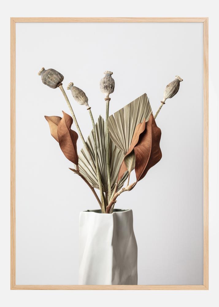 Този изискан постер показва елегантна композиция от сушени растения и семенни шушулки, които се издигат от стилна бяла ваза. Аранжиментът е възхвала на застиналата красота в света на растенията, с разнообразни нюанси от сиво и кафяво до дълбоко ръждивочервени и зеленикави тонове. Тази принт улавя момента на спокойствие, където уникалната форма и текстура на всяко растение са завинаги запазени в изкуството.