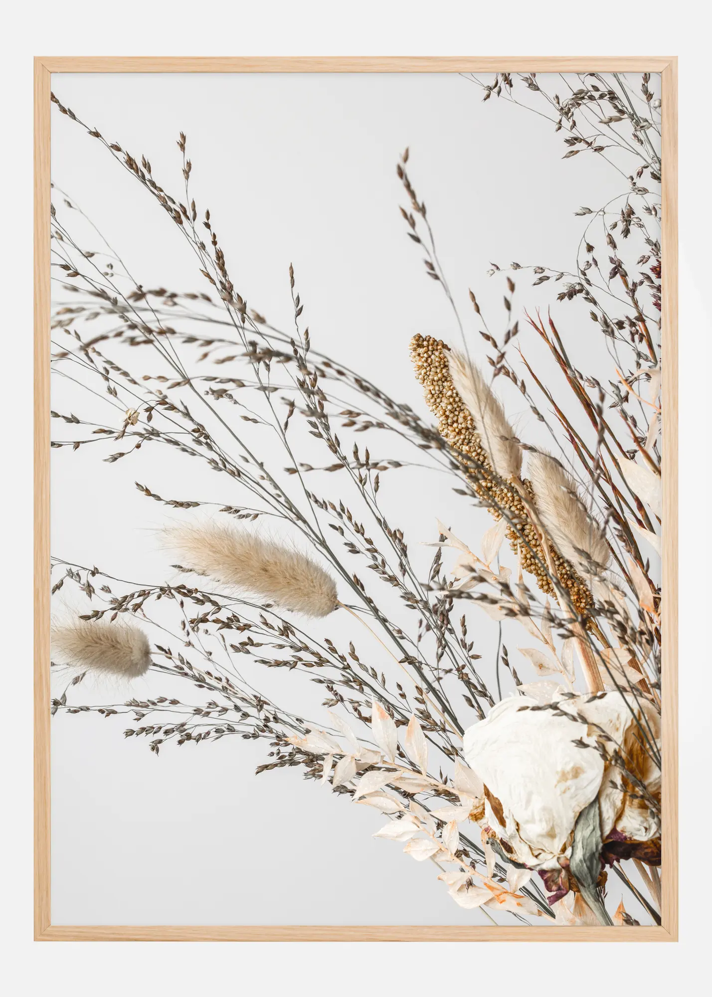 Този постер е празник на тихата елегантност на природата, който изобразява разнообразна аранжировка от изсушени растения. Натуралната композиция е изпълнена с фини линии и органични форми, от люлеещите се треви до здравите класове и деликатно оцветените листа. Палитрата от кафяво и бежово на изсушените растения върху чисто белия фон придава усещане за топлина и природа, което е уловено в спокойствие.