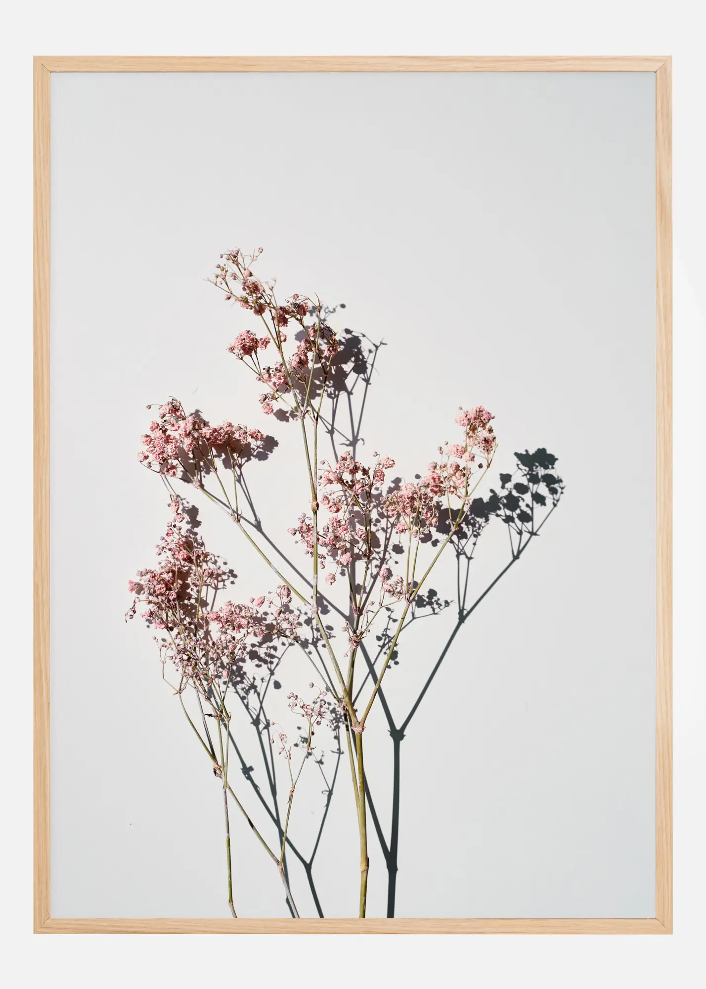 Елегантен постер с група сушени цветя на слънчев, светлосин фон. Сушените цветя стоят изправени с малките цветя в различни нюанси на розово. Меката бледосиня светлина създава усещане за пролет, което внася светлина в дома ви.