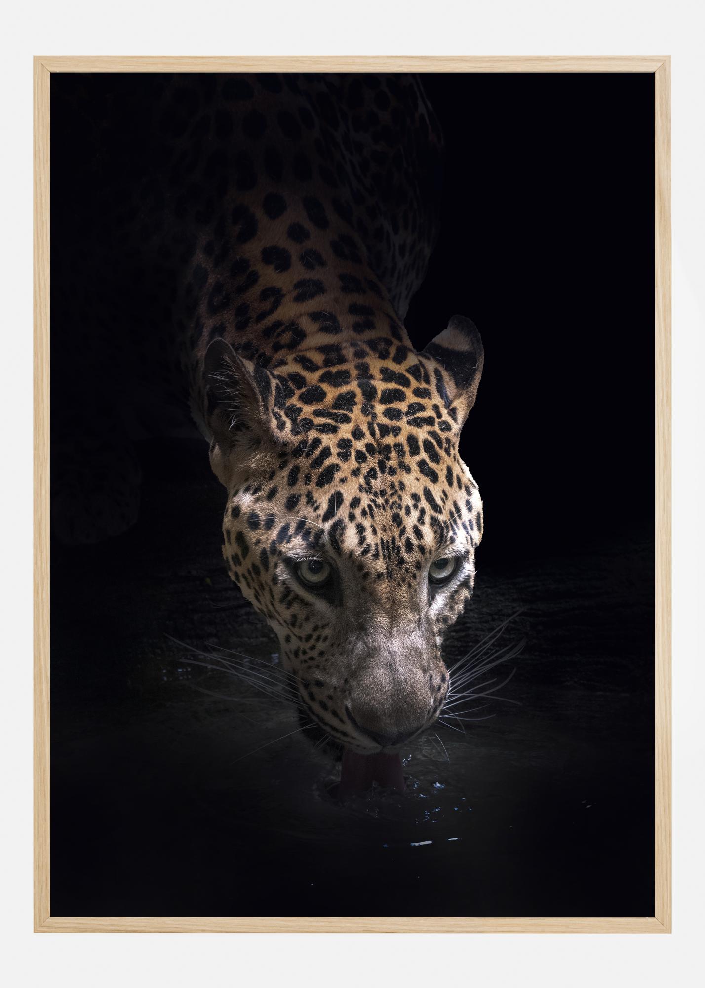 Този драматичен постер улавя леопард в интимен момент, докато той тихо пие вода, мощен момент на дива природа, уловен във времето. Черният фон подчертава златния цвят на великолепната козина и отличителните петна, създавайки почти триизмерен ефект. Леопардът е обърнат към зрителя с поглед, изпълнен с концентрацията и присъствието на диво животно, създавайки непосредствена връзка между животно и човек.