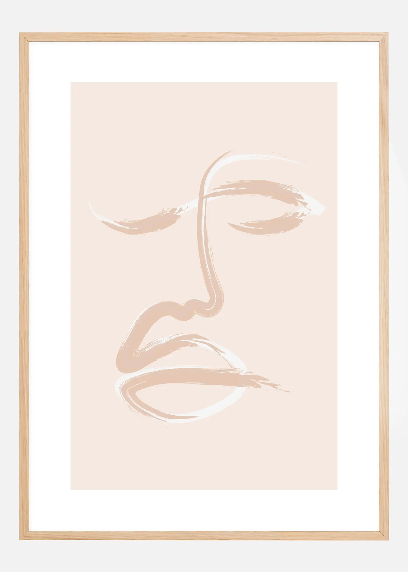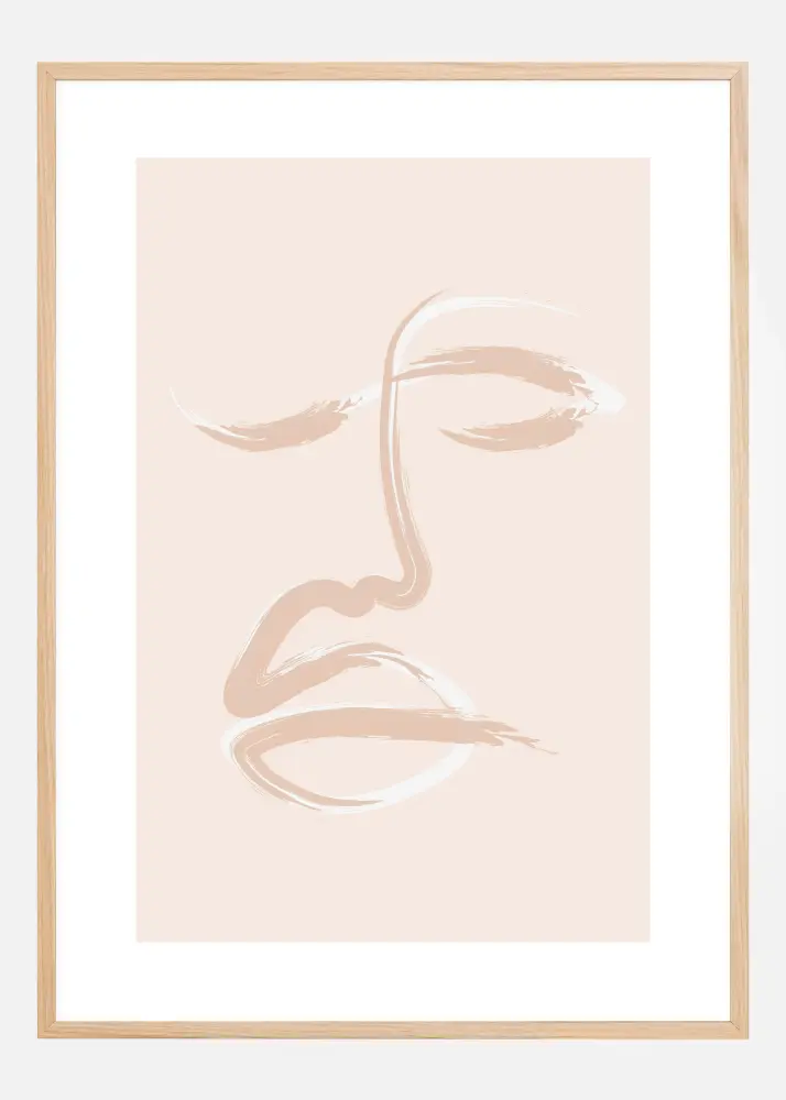 Абстрактен портретен постер с дръзки розови щрихи, които създават лице. Единствен щрих се върти из страната, създавайки носа и устата. Очите са направени по начин, който е почти намигване. Със своята бяла рамка, този постер може да изпъква на пастелно оцветена стена.