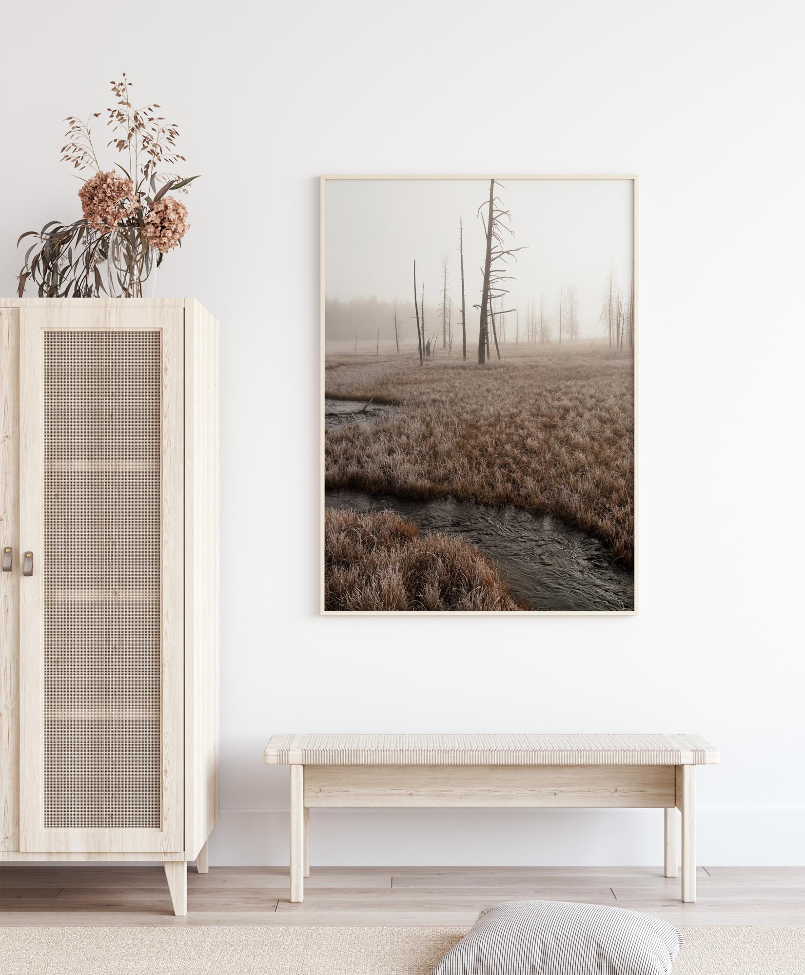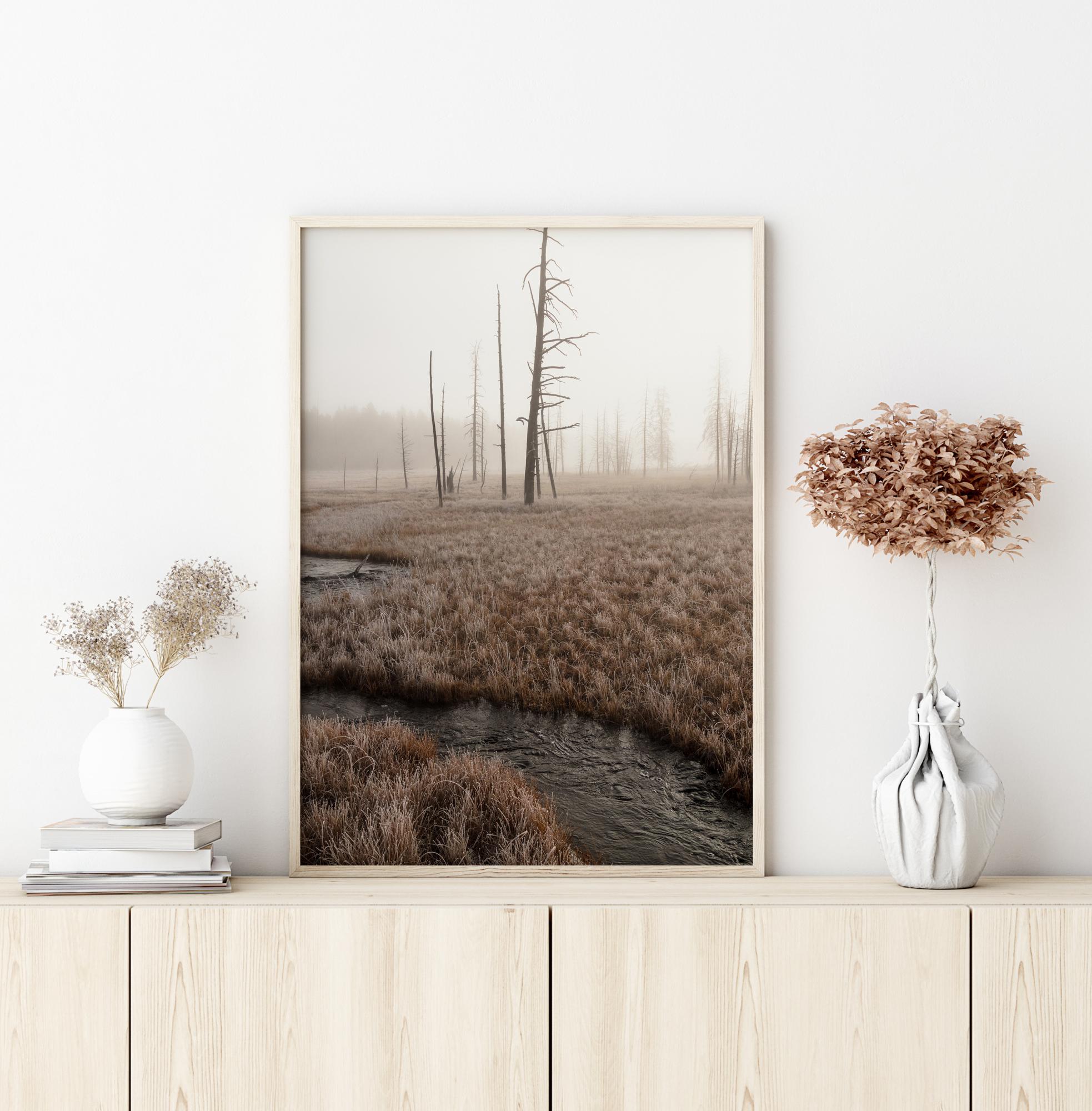 Един свръхестествен пейзажен постер с равнина с мъртви дървета и река, която тече през нея. На тази ранна сутрешна снимка мъглата обгръща дърветата и жълтата трева. Следвайте реката, когато се вие през пейзажа към отдалечената гора. Загубете се в друго време и място, когато закачите това.
