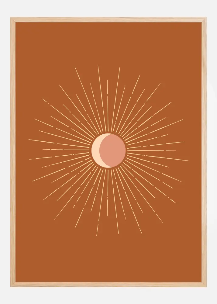 Този минималистичен и елегантно проектиран постер с абстрактно затъмнение на слънцето ще бъде стилен и модерен акцент на всяка стена. Със своите чисти линии и блестящ мотив върху наситен теракотен фон, този печат представлява перфектното смесване между простота и изтънченост. Централният елемент в дизайна, кръг с експлозия от линии, символизира светлина и енергия и добавя динамичен ефект в стаята.