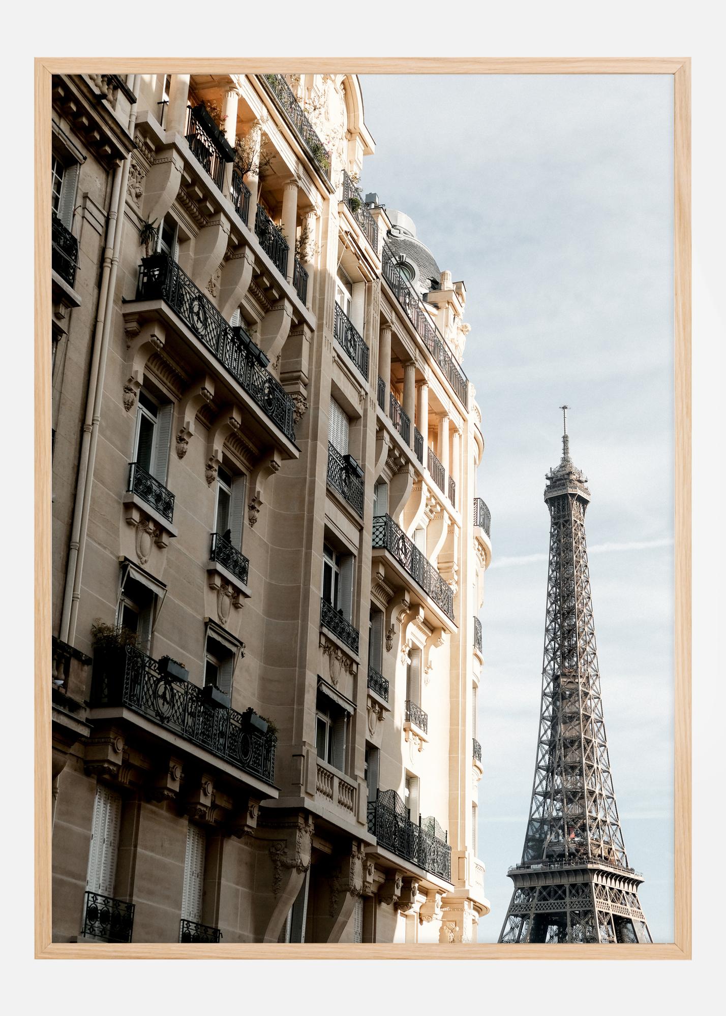 Този постер изобразява класически изглед на Париж, където Айфеловата кула гордо се издига зад типичните за града жилищни сгради с техните ковани железни балкони и скулптурни фасадни детайли. Това е сцена, която излъчва парижка атмосфера и елегантност, перфектна за добавяне на нотка френски чар към всеки дом. Изображението улавя перфектния баланс между архитектурните съкровища на града и откритото небе, което придава усещане за пространство и свобода, което е синоним на парижката душа.
