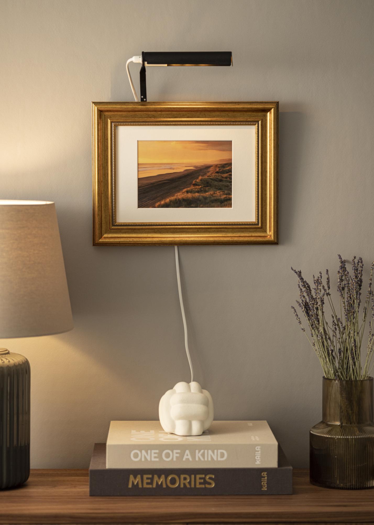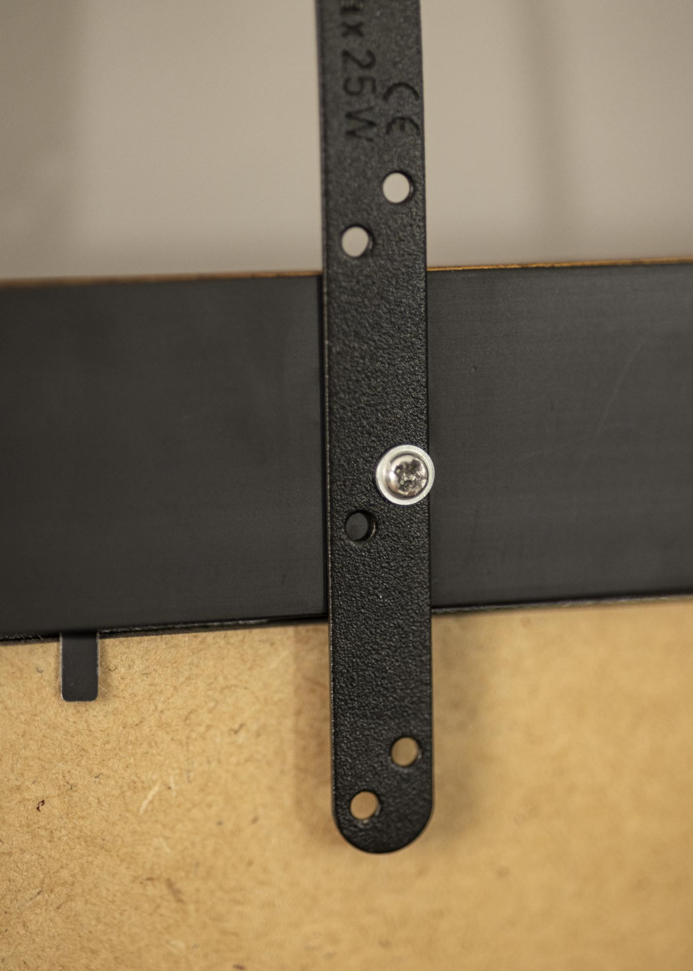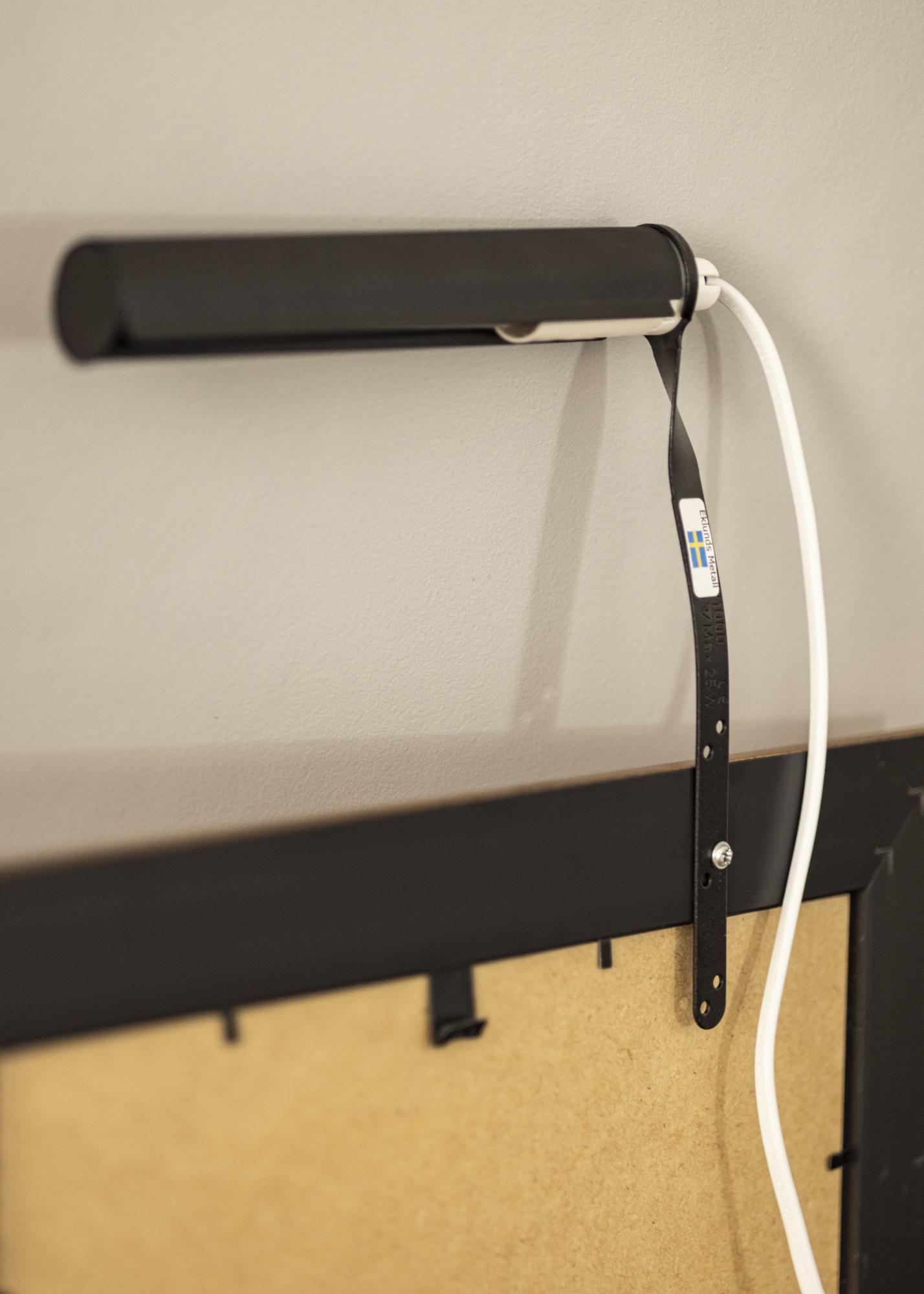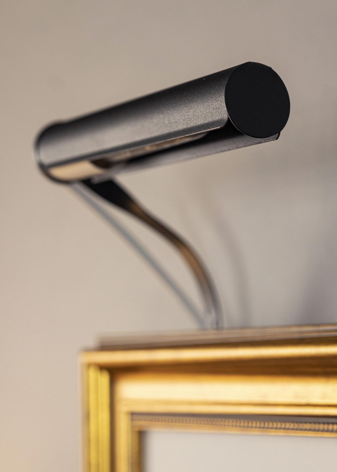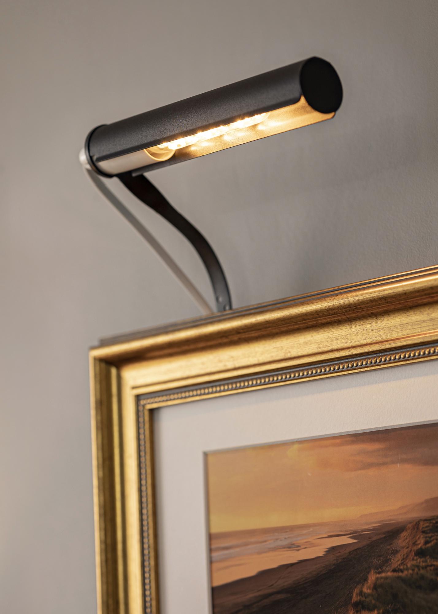 Обикновено прикрепяте осветлението за картини към задната част на рамката, недостатъкът на това е, че е необходима дървена рамка (някои композитни рамки също са подходящи) с широка профил, за да може да се завинтва в рамката. С нашето стенно закрепване няма нужда да мислите за това, а просто монтирате осветлението за картини директно на стената зад картината.