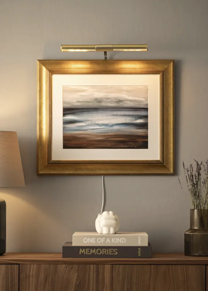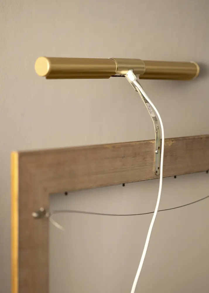 Обикновено закрепвате осветлението за картини на задната част на рамката, недостатъкът е, че се изисква дървена рамка (някои композитни рамки също са подходящи), която има широка профил за да е възможно да се завие в рамката. С нашето стенно закрепване не мислите за това и просто монтирате осветлението за картини директно на стената зад картината.