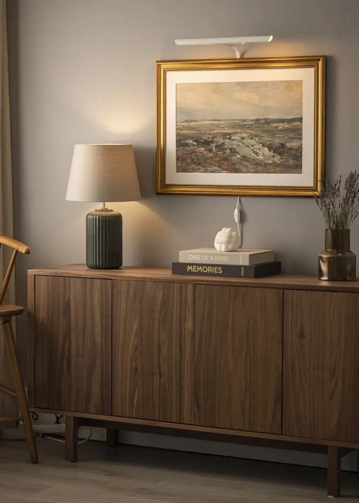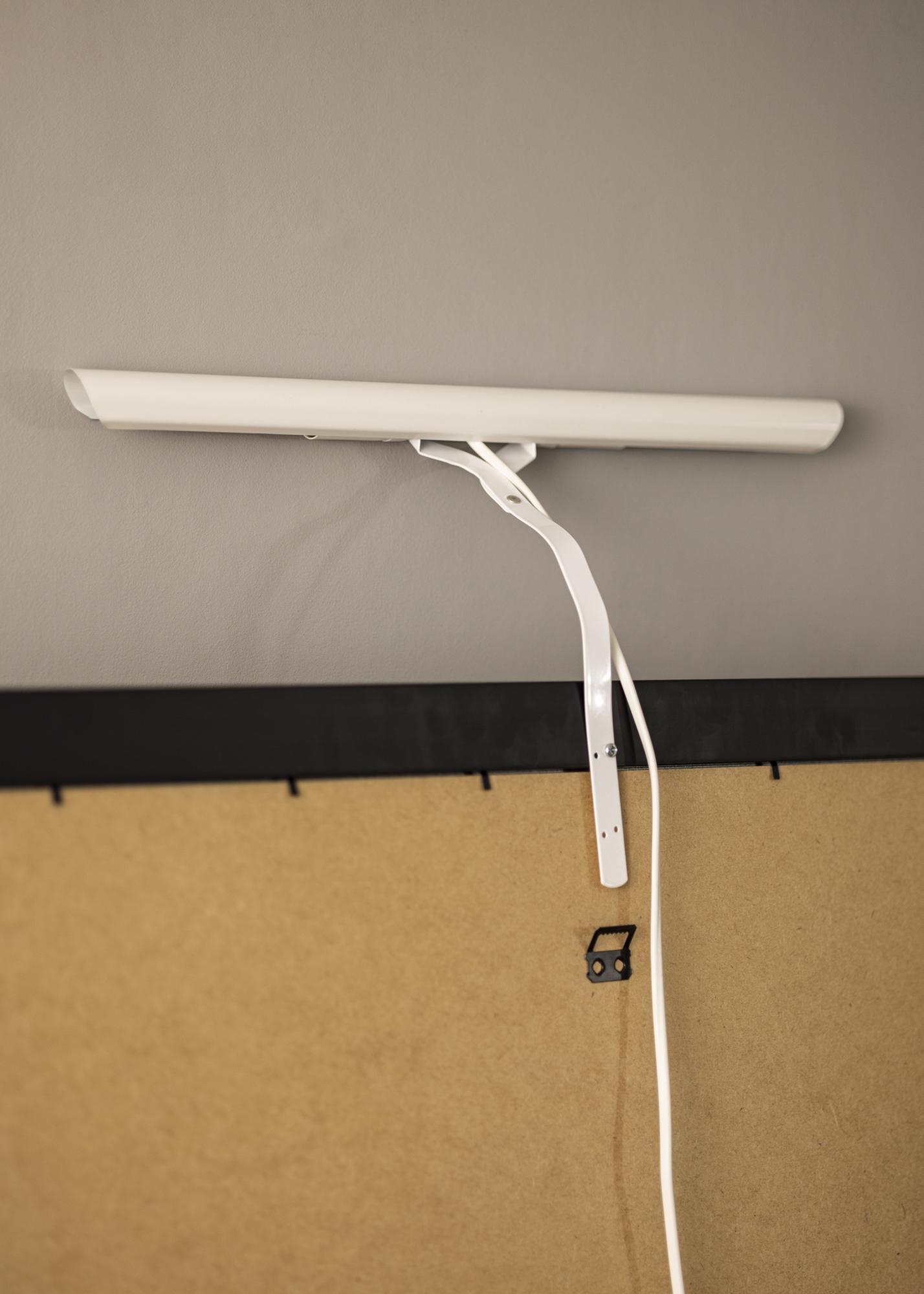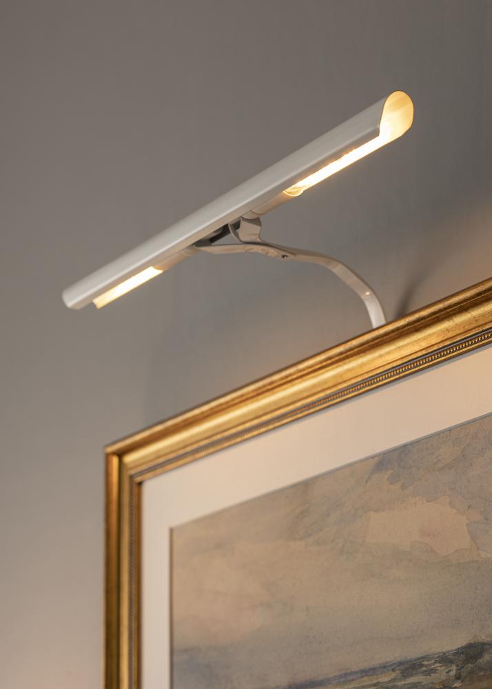 Обикновено прикрепваш осветлението за картини на задната страна на рамката, недостатъкът на това е, че е необходима дървена рамка (някои композитни рамки също са подходящи), която има широка профил, за да бъде възможно завинтването в рамката. С нашата стенна скоба няма нужда да мислиш за това, а просто монтираш осветлението си за картини директно на стената зад картината.