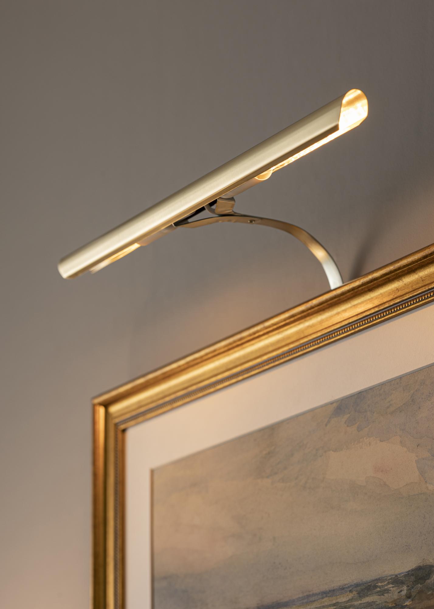 Обикновено поставяте осветлението за картини на гърба на рамката, a недостатъкът на това е, че изисква дървена рамка (някои композитни рамки също са подходящи) с широка профилна част, за да може да се завинти в рамката. С нашите стенни скоби няма нужда да се притеснявате за това, просто монтирате осветлението за картини директно на стената зад картината.