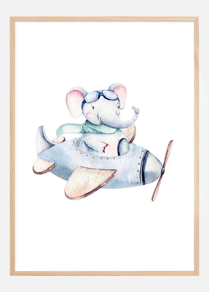 Свежият син цвят на самолета хармонизира прекрасно със сивите тонове на кожата на слончето, докато фините розови оттенъци в ушите придават мекота на изображението. Това е художествен постер, който обещава да стане мигновен фаворит в детска стая или игрална зала, вдъхновяващ към часове на креативна игра и въображаеми истории. Той е също така сладък стилизиран елемент от интериора, който може да привлече и зарадва окото във всяко спокойно жилищно пространство.