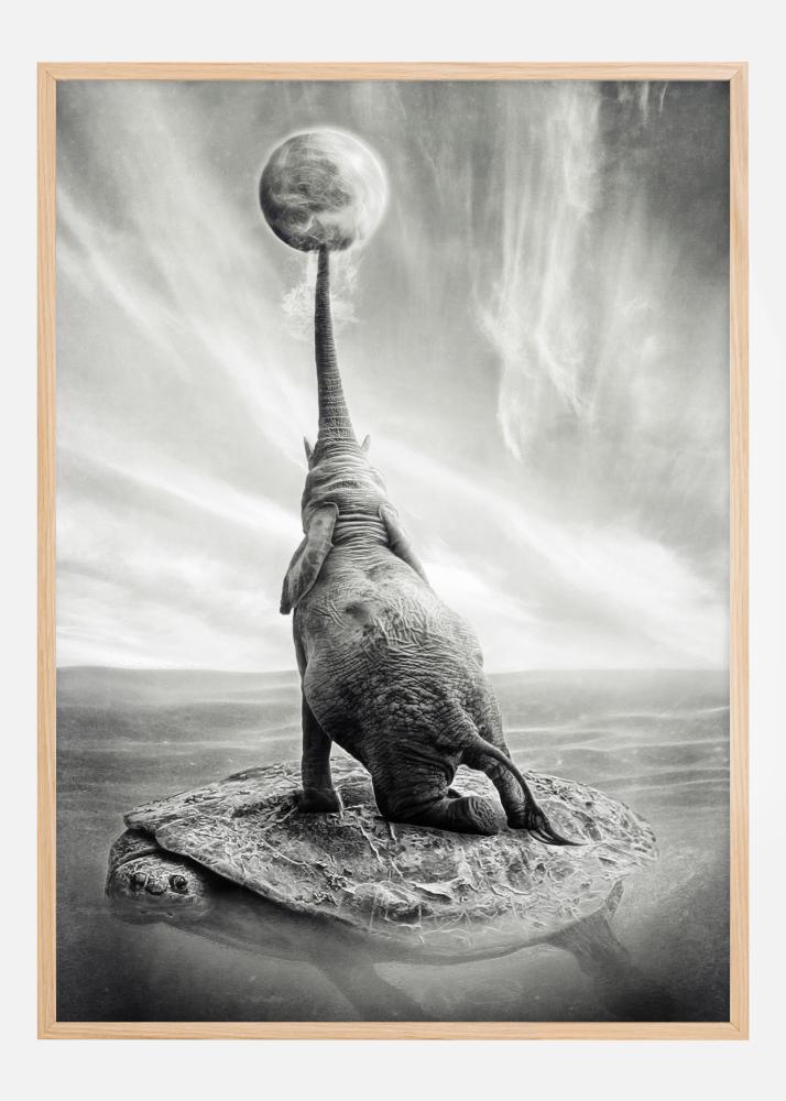 Този завладяващ черно-бял плакат улавя сюрреалистично изображение на слон, който стои върху костенурка и балансира планетарен глобус на хобота си. Изображението излъчва мощна символика и играе с елементи от митологията и фантазията. Текстурираната кожа на слона и костенурката, детайлна и изпъкваща, придава почти осезаемо измерение на произведението, докато размития фон от облаци и пейзажи допринася за мечтателна и естетическа атмосфера.