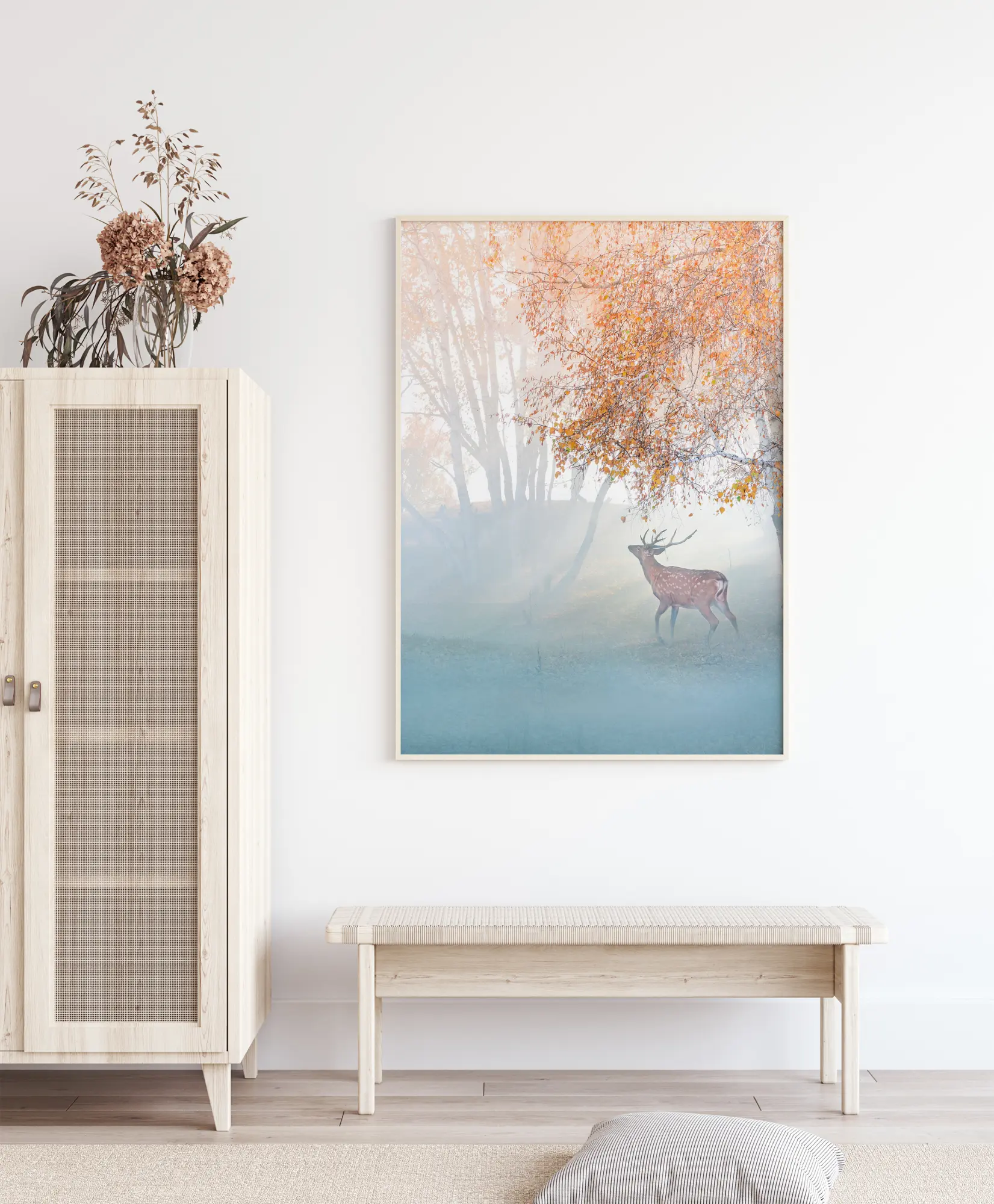Един фантастичен постер за природа с елен, изгубен в мъглата. Тази мъглива картина създава усещане за магия и учудване, докато еленът се движи през пейзажа. Смес от оранжеви и сини цветове създава мека, обгръщаща атмосфера с леки лъчи светлина, които меко преминават през дърветата. Потъни в тази магическа земя.