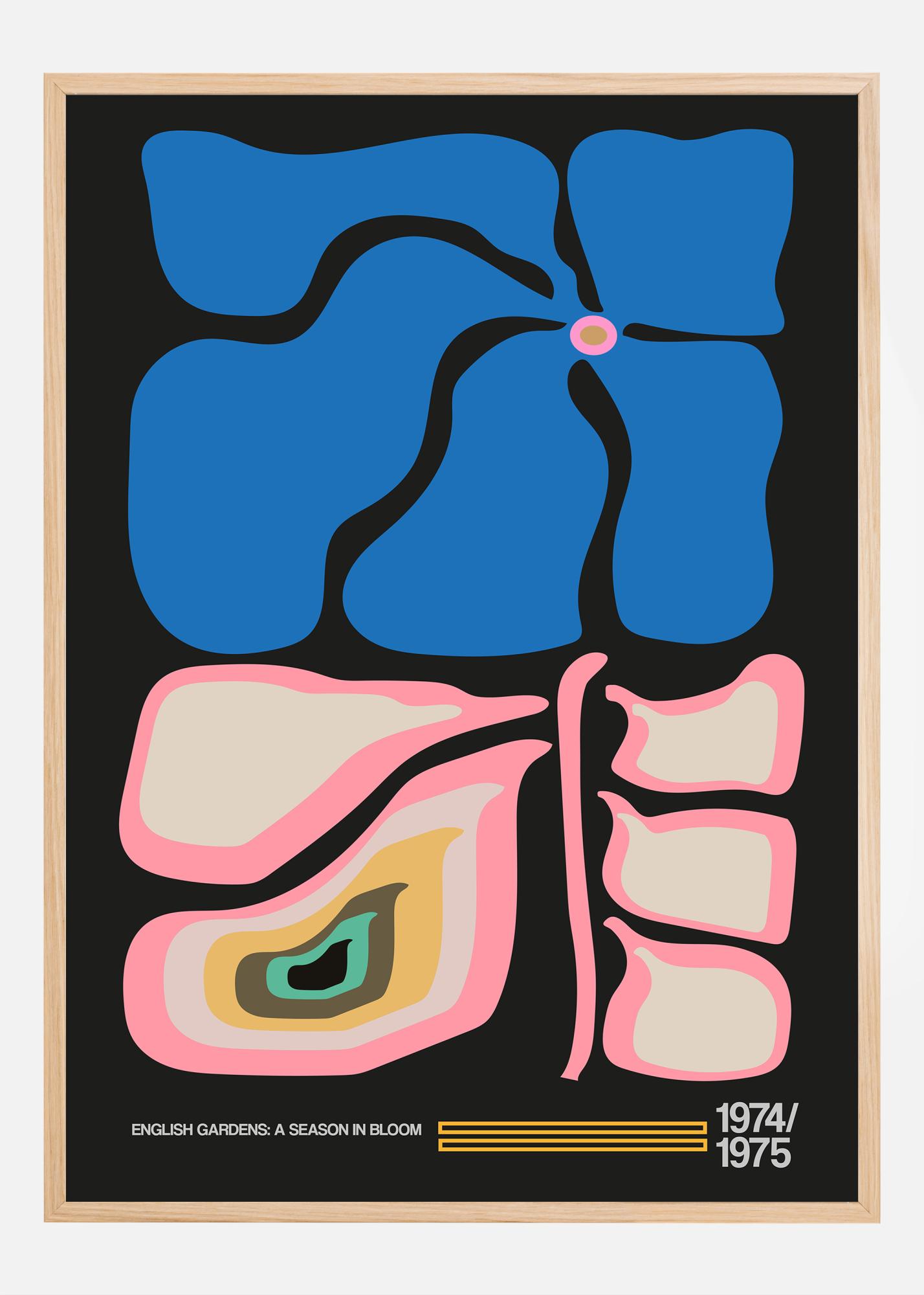 Този креативен и цветен плакат 'English Gardens: A Season in Bloom' е естетически поклон към разнообразието и великолепието на градинския цъфтеж. Плакатът привлича окото със силното си, синьо цвете, което контрастира на черен фон, допълнен с акцентни цветове в розово, бежово и намек за зелено. Тази специална комбинация от цветове предлага смело и съвременно тълкувание на класическа английска градина в пълен разцвет. Годината '1974/1975' добавя историческо измерение, което може би подсказва значим период за градините или изкуството.