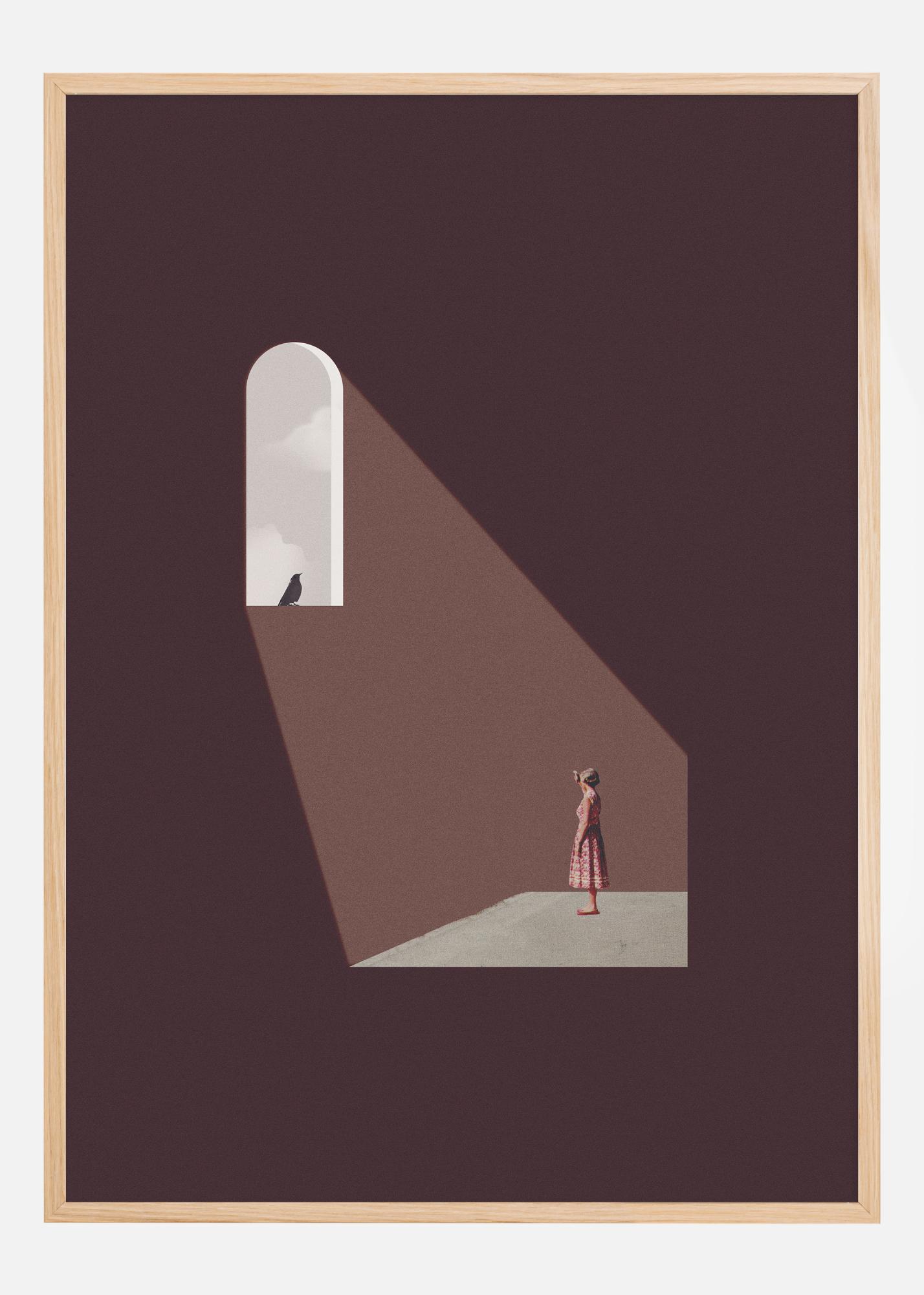 Този минималистичен плакат улавя тих момент на размисъл. Една фигура стои под лъч светлина, който се процежда през прозорец, символ на просветление и отражение. Картината е наситена с меки кафяви и бежови тонове, които създават топла и приветлива атмосфера.