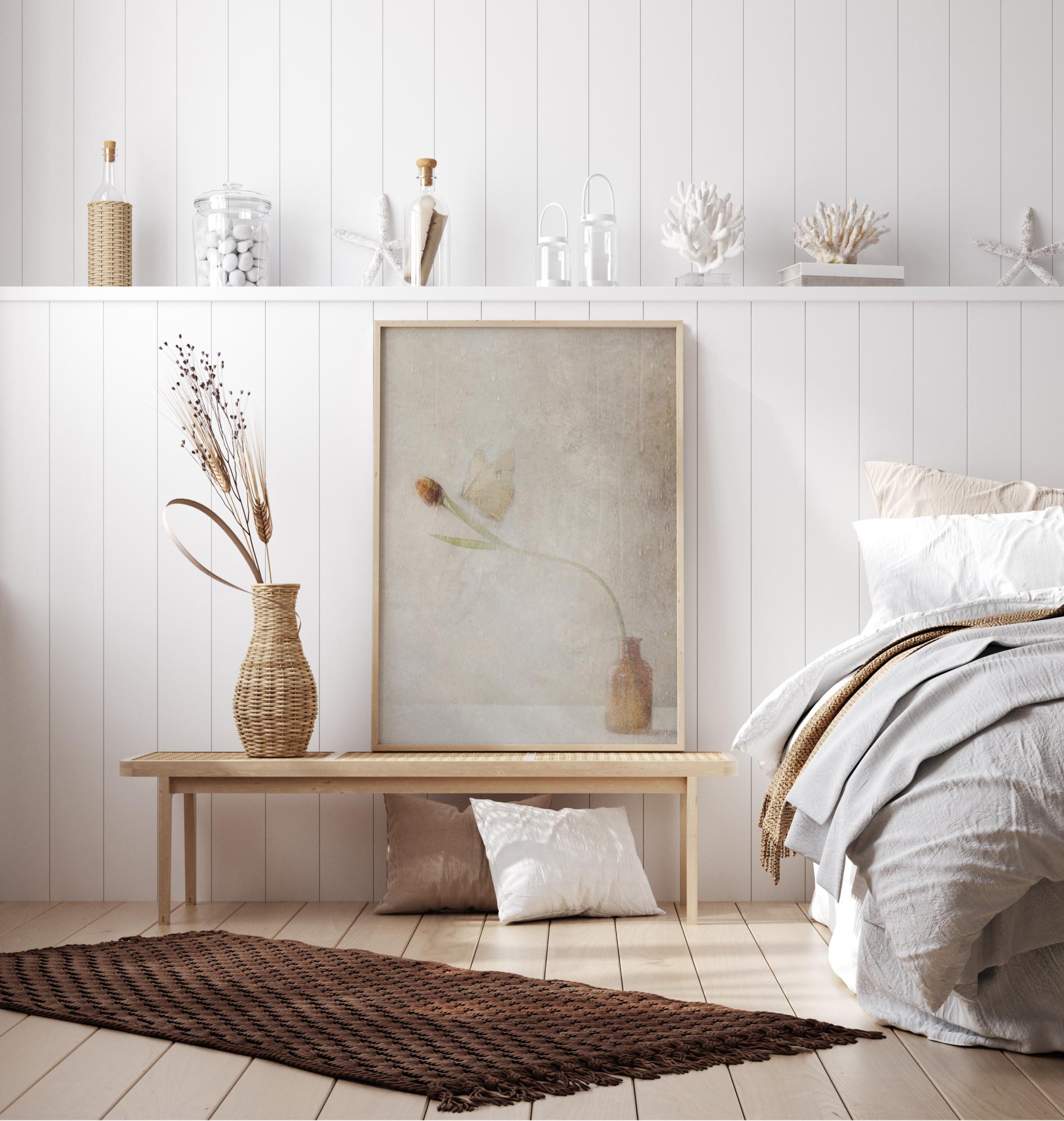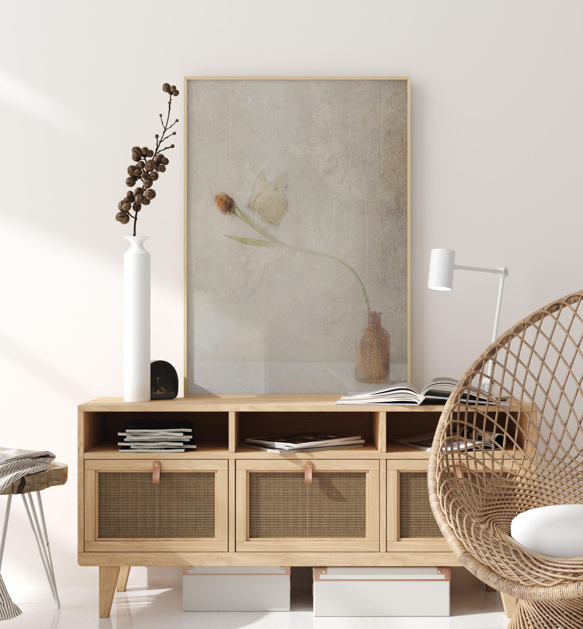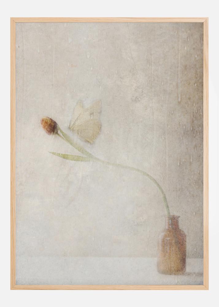 Дискретен постер с пеперуда, която каца върху цвете. Този фин образ в кафяви тонове внася топлина в стаята. Пеперудата каца нежно върху цветето, което се навежда надолу към центъра на изображението. Криле почти се сливат със стената зад него в тази краткотрайна среща.