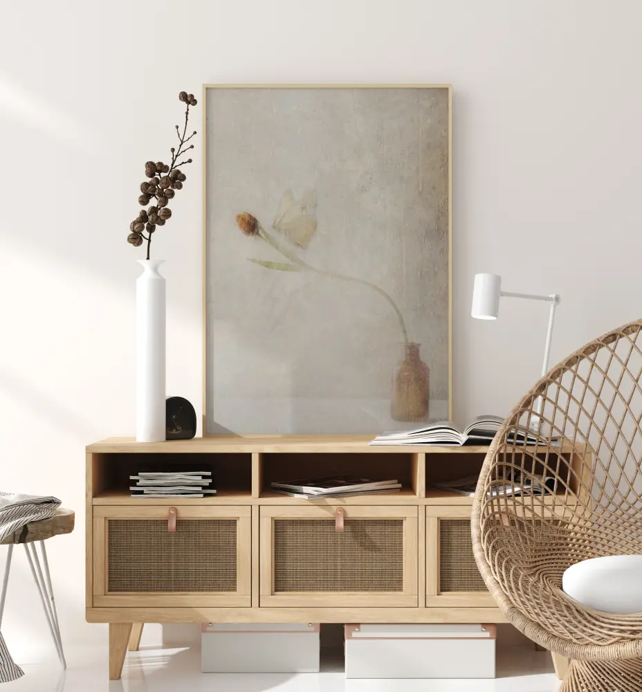 Дискретен постер с пеперуда, кацаща върху цвете. Тази фина картина с кафяви нюанси придава топлина на стаята. Пеперудата се приземява леко върху цветето, което се накланя надолу към средата на изображението. Криле почти се сливат със стената зад тях в тази краткотрайна среща.