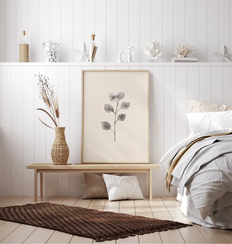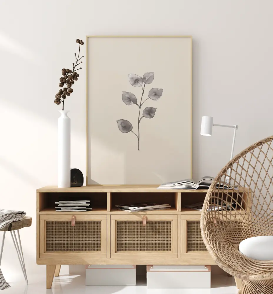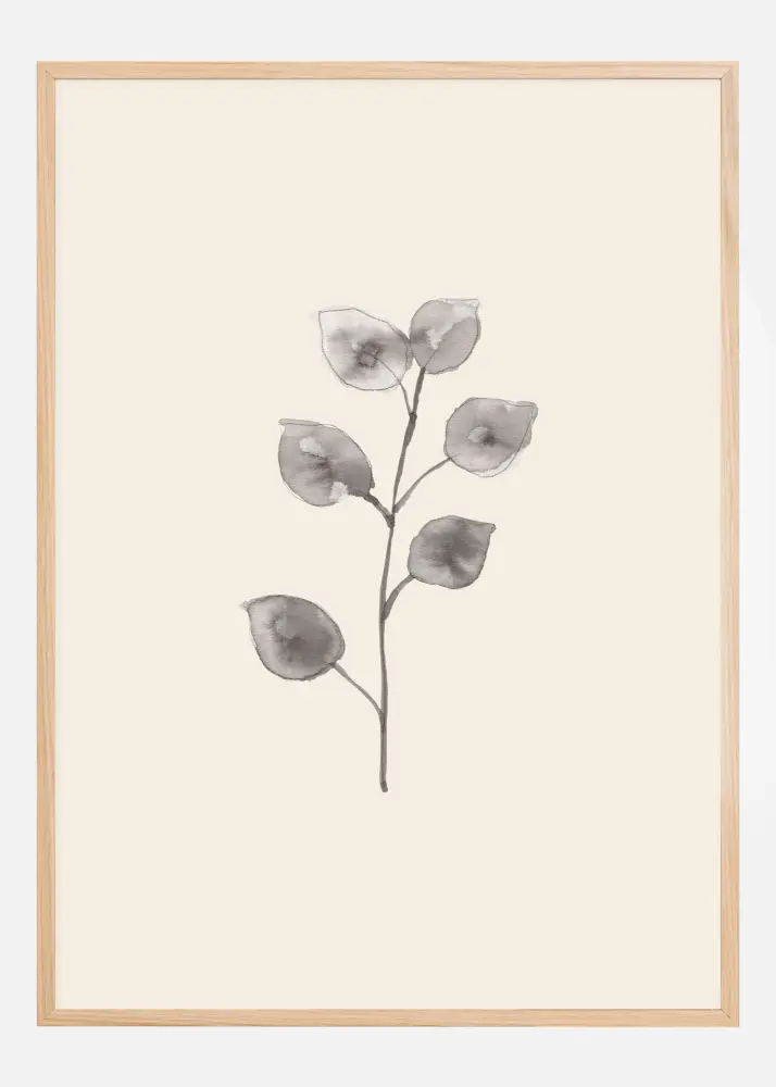 Елегантен постер със семпла картина на клон от евкалипт. Листата са направени в акварелен стил, за да са меки и ръбовете почти са размити. В прост сив тон листата изпъкват на белия фон. Окачете го на зелена стена, за да добавите цвят.