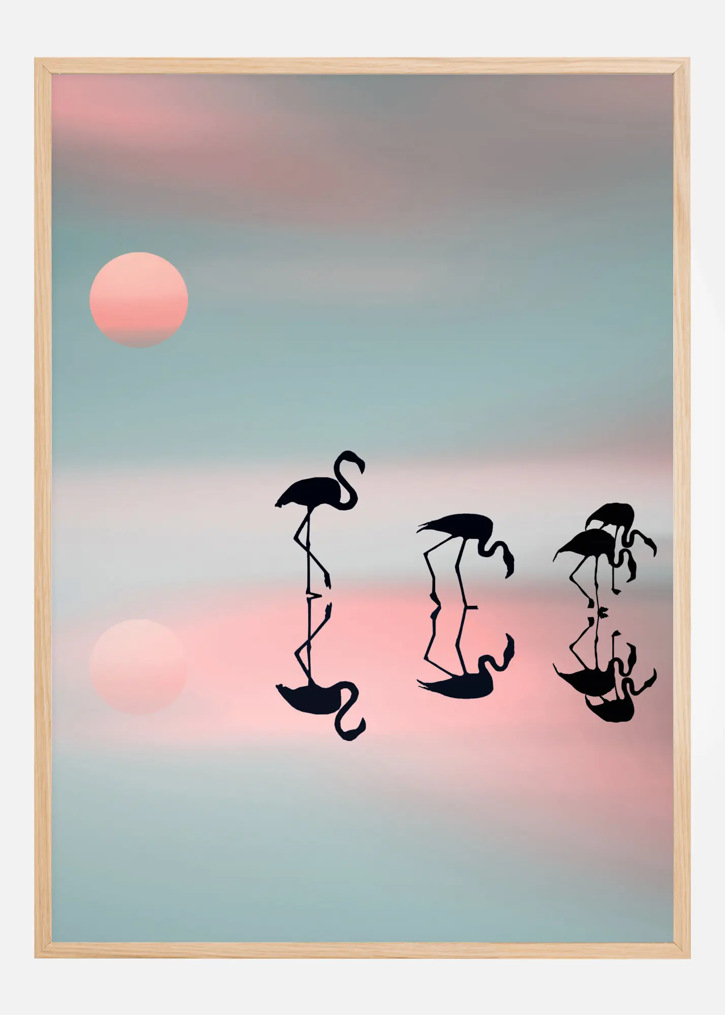 Ярък постер с четири фламинго, които се хранят при светло пастелно езеро. Синя, розова и прасковена светлина създават мека картина със силуета на семейството фламинго, което внимателно преминава през езерото. Почти можете да почувствате спокойствието в тази мека, деликатна картина.