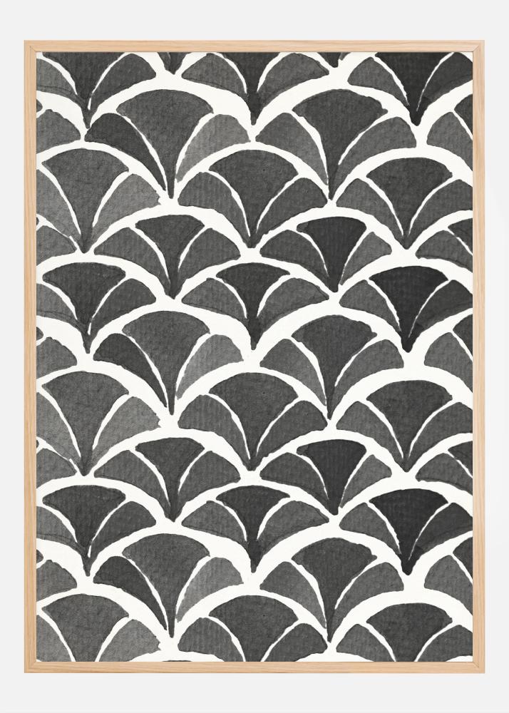 Придайте на пространството си нотка на артистичен елеганс с този постер, който има завладяващ модел на листоподобни пера в черно и бяло. Тази печатна творба има повтарящ се модел, който напомня на винтидж вентилатори, подредени ритмично по цялата повърхност, за да създадат усещане за движение и симетрия. Стилният контраст между черното и бялото придава класически вид, който се вписва в много различни стилове и среди за интериорен дизайн.