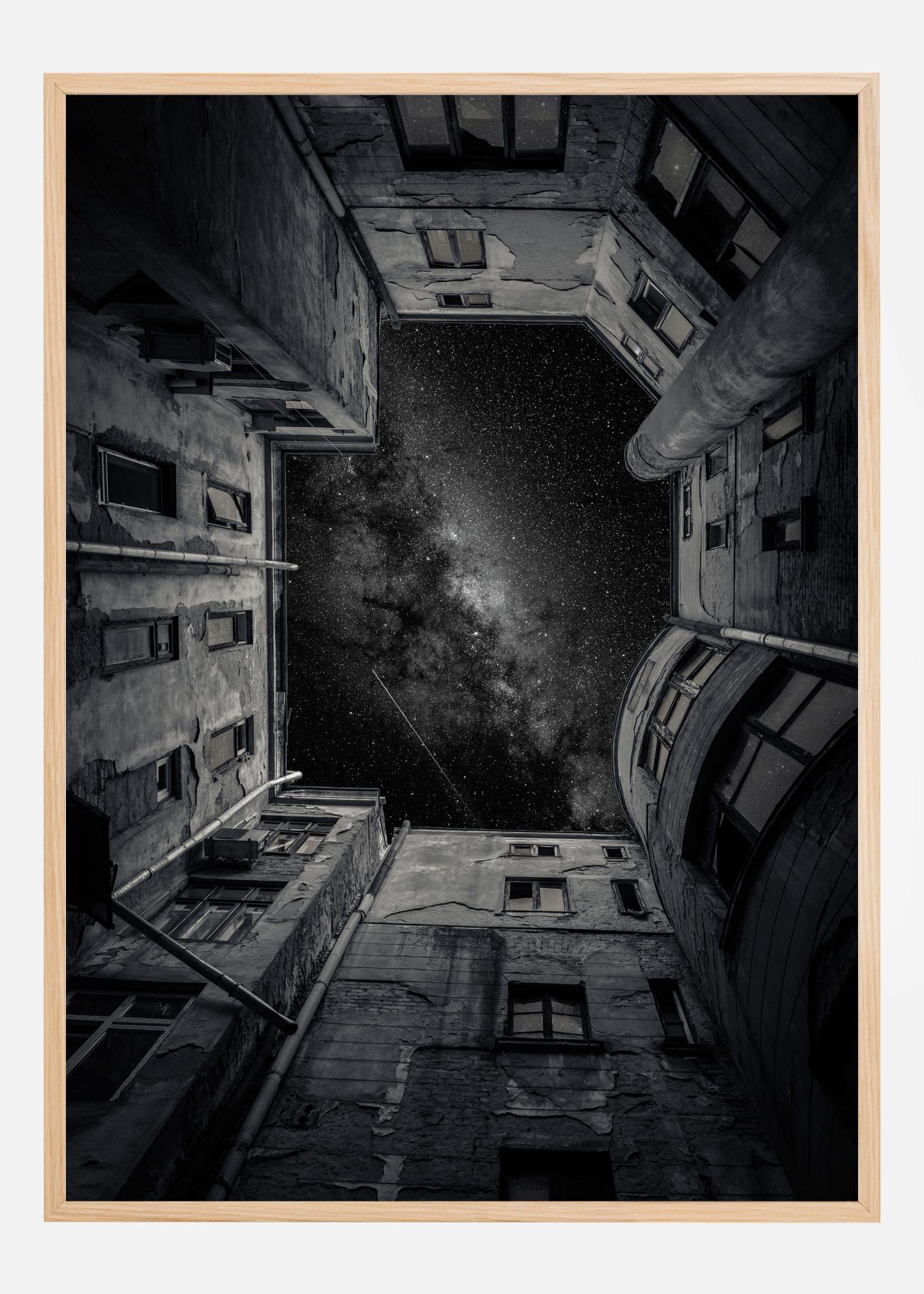 Тази фотография предлага уникална перспектива, която привлича погледа на наблюдателя нагоре покрай фасадите на стари сгради към звездно небе. Тъмните тонове и текстурите на сградите създават усещане за история и течението на времето, докато звездите отгоре добавят чувство за вечност и безкрайност.