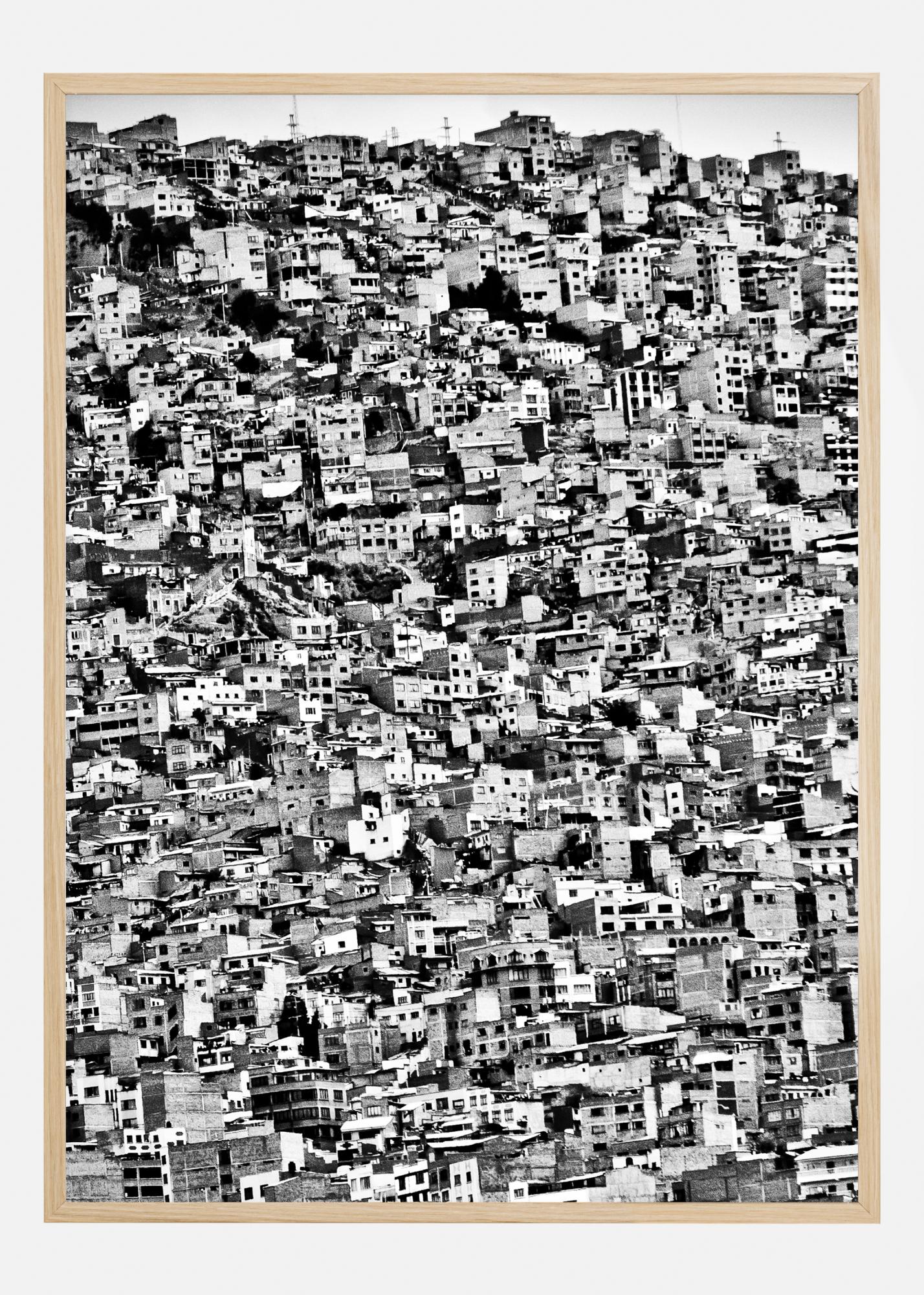 Постер на градския пейзаж с хиляди малки къщи в El Alto La Paz Favela в Боливия. Изображението е изпълнено с белите фасади на къщите и техните отворени черни прозорци, които създават неспокоен, но завладяващ образ. Изгубете се в лабиринта от къщи, когато го закачите у дома.