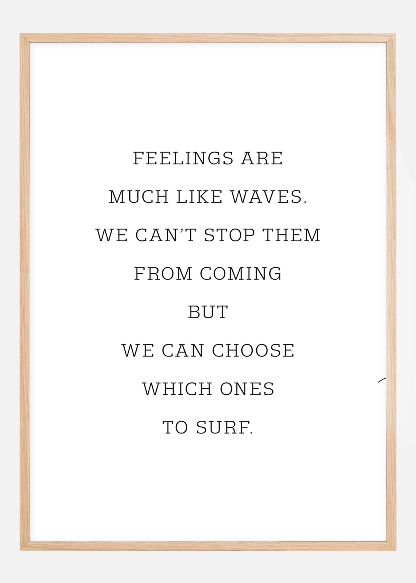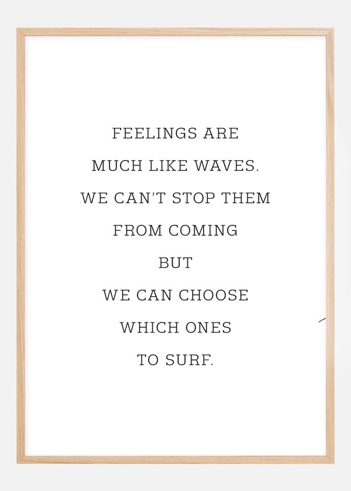 Мотивационен плакат, който да ви вдъхновява всеки ден. Чувствата са много като вълни. Не можем да ги спрем да идват, но можем да изберем на кои да сърфираме. Започнете деня си с тази силна цитата в прост шрифт на обикновен бял фон.
