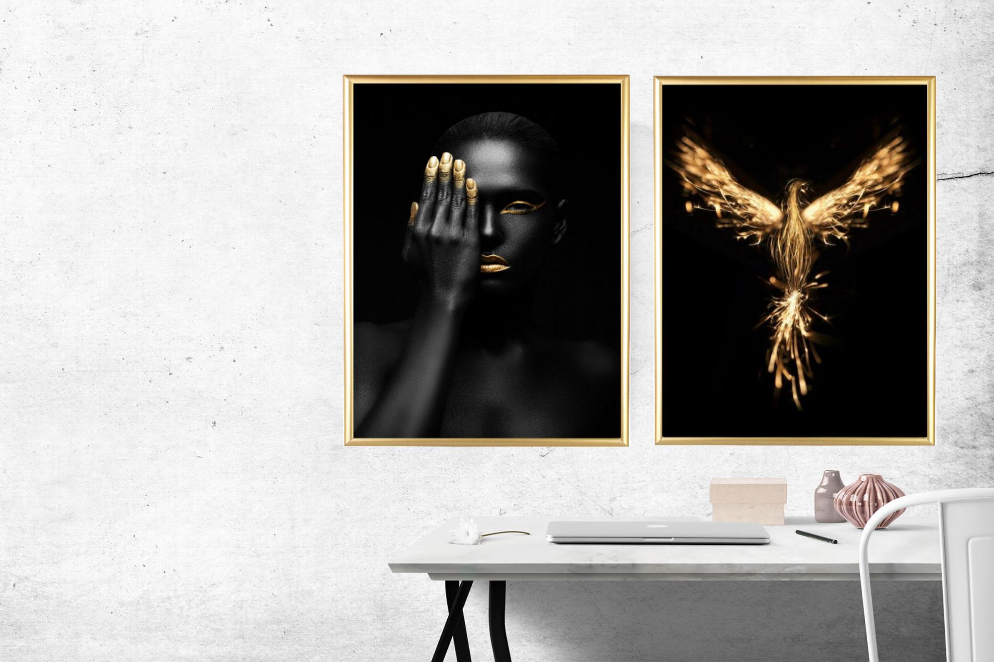 Чрез графично изкуство птицата Феникс приема форма в фойерверк от златисти тонове на черен фон. Топъл и приятен постер в минималистичен формат, идеален за комбиниране с други любими в по-голямо колаж.