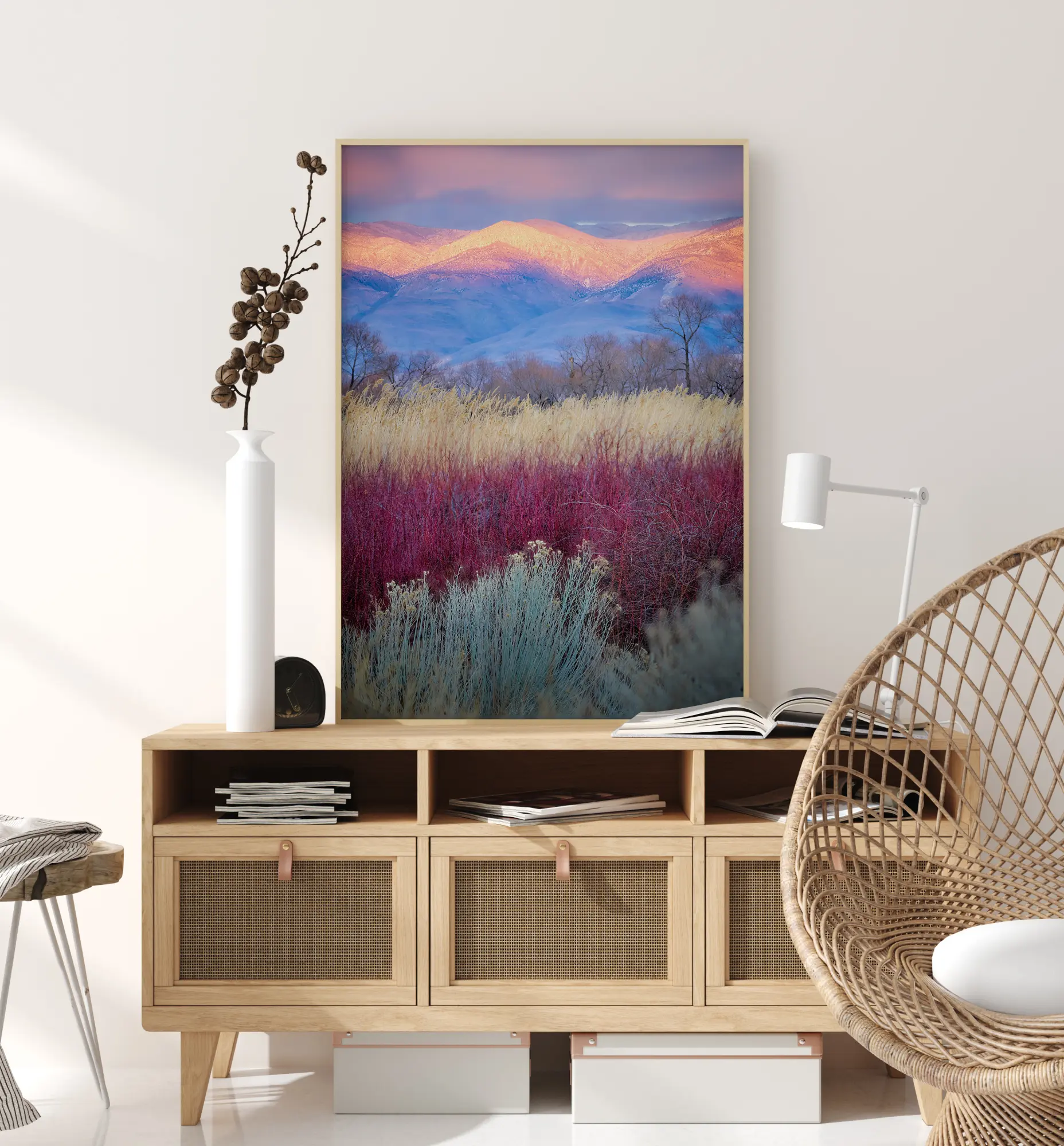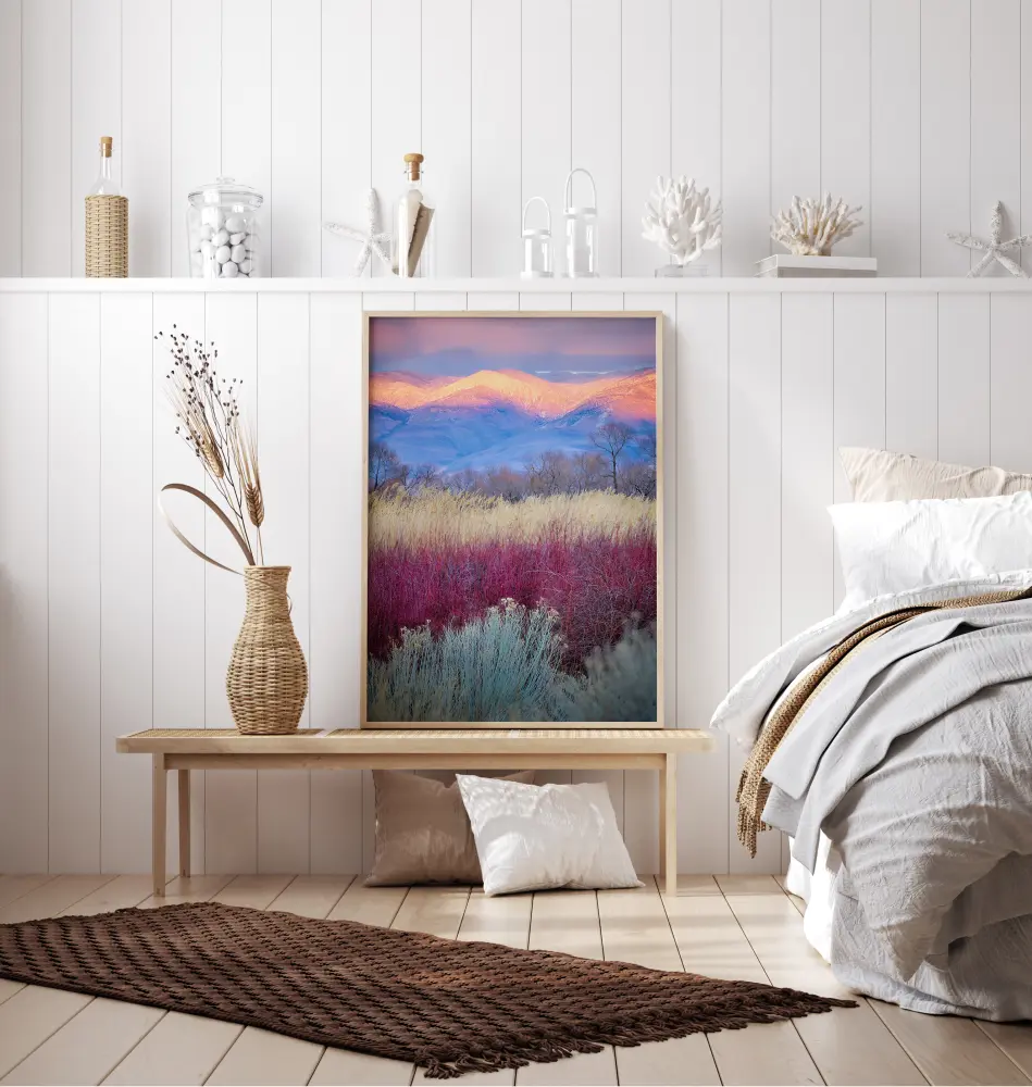 Един цветен плакат на полета, които се простират към далечни планини. Ярки цветове водят погледа от зелено, розово, жълто, синьо до оранжево. Слънцето едва се показва над планините в далечината. Почувствайте ранната утринна светлина и новия ден в това произведение.