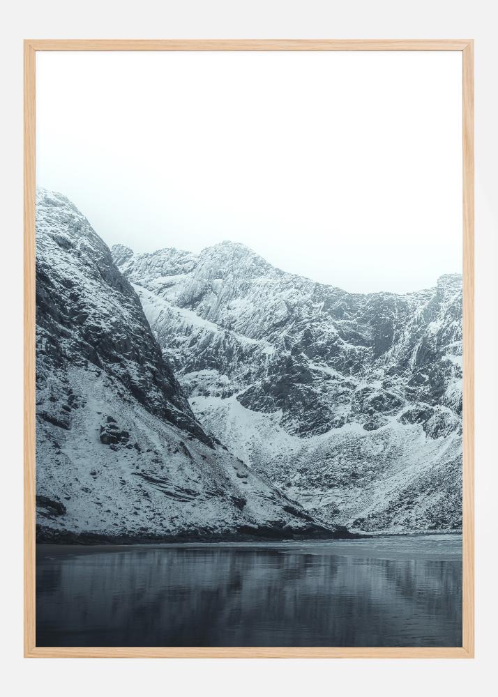 Драматичен постер със снежни планини, които водят към спокойно езеро. Езеро или може би фиорд се разпростира към снежните планини и ги среща на преден план. Светла бяла небеса помага да се създаде усещане за зима. Пренесете студеното време вътре, когато окачите тази картина.