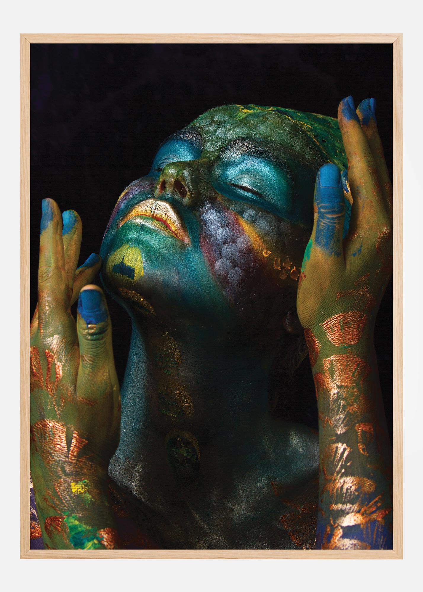 Многобагрен портретен постер с жена, която накланя глава назад и обгражда лицето си с ръце. Тя е покрита със светящи, силни цветове, които създават красива смесица от дива цветност. Изберете един от цветовете в картината и го съчетайте на стената си за допълнителна изразителност.