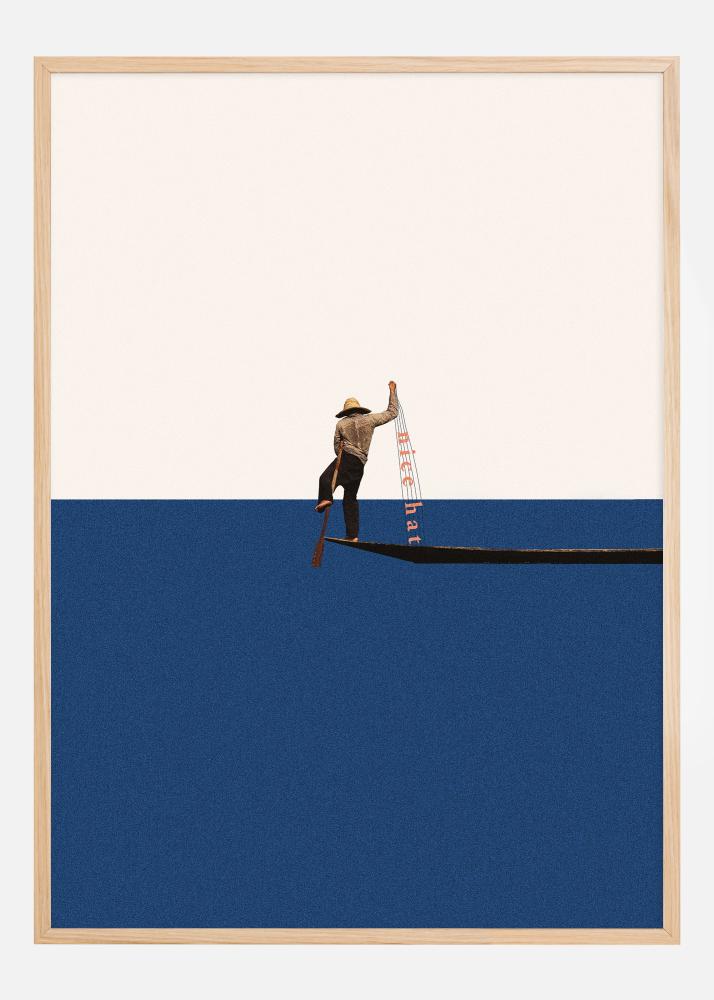 Цветовата палитра е ограничена, но изразителна, с доминиращия син оттенък на водата, който навява мисли за спокойствие и дълбочина. Светлобежовият фон предоставя неутрален канвас, позволяващ на другите цветове да изпъкват. Контрастиращите цветове; кафяво, синьо, бежово и акценти на червено, взаимодействат за създаване на балансирана и привлекателна естетика. Това е принт, който предлага повече от просто визуално удоволствие; това е разговорно начало, което подхожда както в антре, така и в хол или офис.