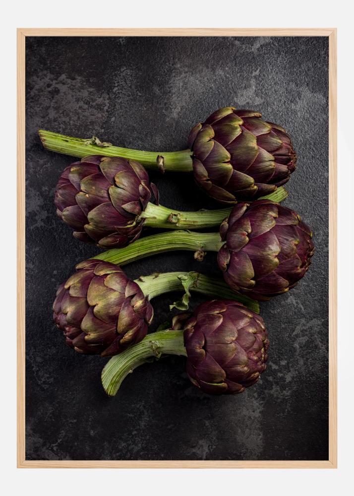 Този рустикален и вдъхновен от природата постер изобразява пет нюансирани артишока на тъмен, текстуриран фон. Близкият кадър подчертава тъмнозелените и пурпурночервени нюанси на листата на артишока, а земният мотив би паснал добре в кухня или трапезария, където може да вдъхнови кулинарни приключения. Тази печат е не само почит към красотата на природата, но и напомняне за способността на прясната храна да събира хората заедно.