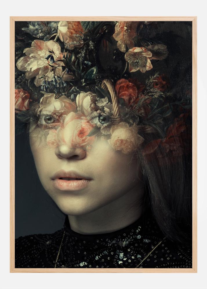 Този пленителен плакат съчетава красотата на човешкия портрет с неподправената естетика на природата. Произведението изобразява жена, чието лице е частично скрито от богат цветен аранжимент, което придава мистичен и почти съновиден ефект. Това произведение на изкуството със своята цъфтяща корона и мека, натуралистична цветова палитра излъчва безвременна елегантност и артистична изтънченост.