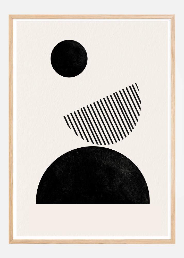 Този артистичен плакат се характеризира с игривото си използване на геометрични форми и текстури за създаване на балансирана и модерна композиция. Голяма черна окръжност е разположена отгоре, следвана от диагонално нараден полукръг и солидна черна полукръгова форма в основата. Всеки елемент допринася за усещането за движение и динамика, докато единното оцветяване създава чувство за свързаност и простота.