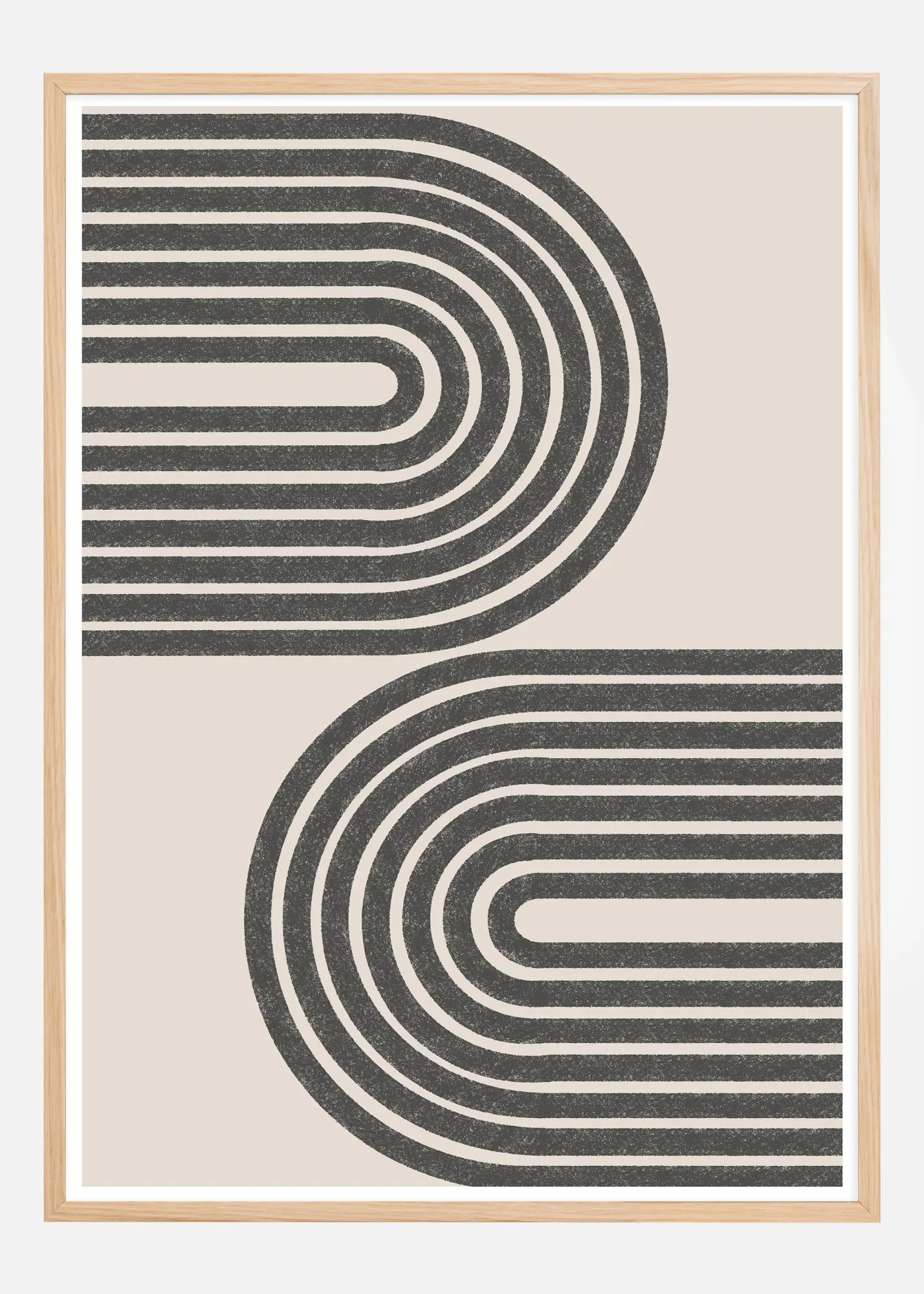 Този стилен и съвременен плакат се отличава с динамичната си композиция от двойни концентрични форми, които се сливат в елегантен танц. Дизайнът балансира между движение и неподвижност, където черните линии хармонично се извиват върху топлия, неутрален фон. Игривата, но все пак подредена структура в черно и екрю е отлично допълнение за клиентите, които търсят впечатляващ принт, за да украсят своя дом или офис пространство.