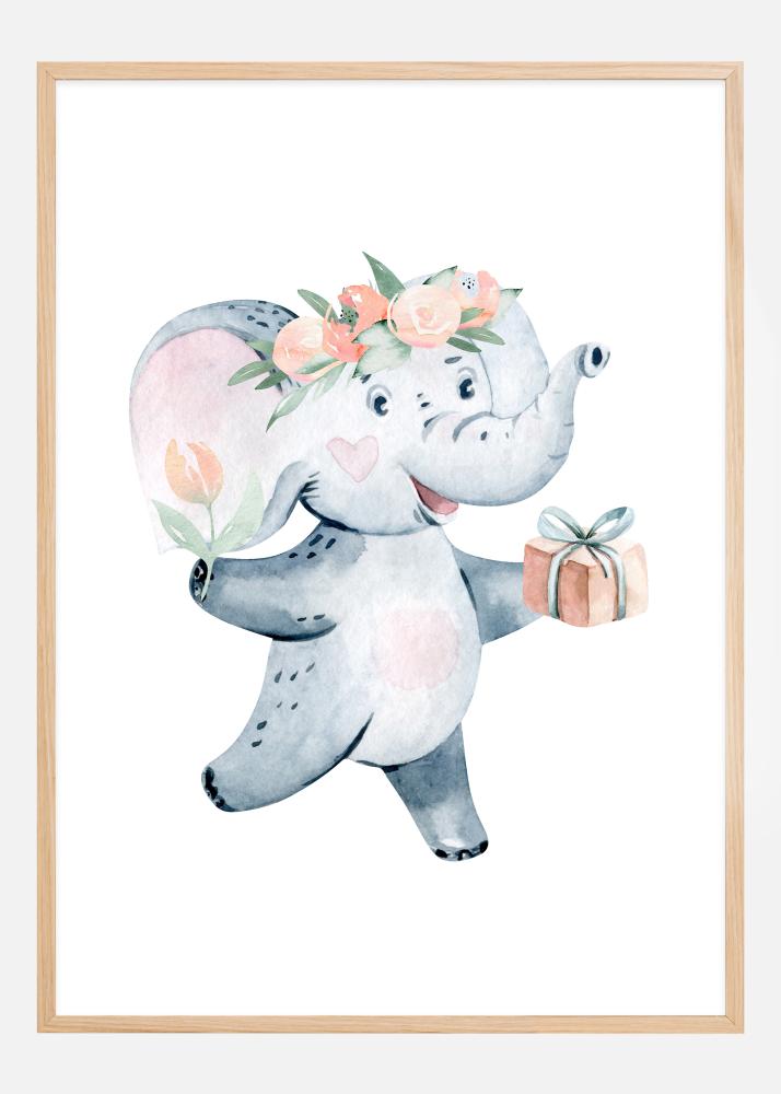 Повдигнете настроението в която и да е стая с този очарователен плакат с изображение на слон, който излъчва радост и невинност. Тук е показан чаровен сив малък слон, който грациозно пристъпва, украсен с цветен венец в розови и прасковени тонове на главата. Изразът на животното е изпълнен с доброта и щастие, и държи внимателно опакован подарък, което добавя допълнително усещане за радост и щедрост към сцената.