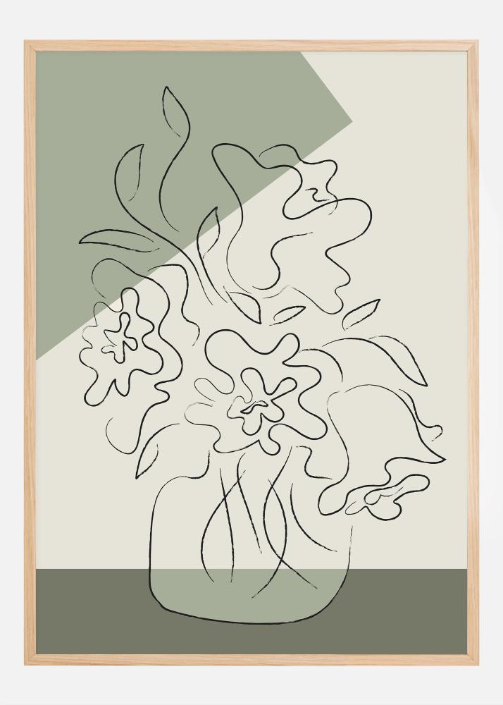Този артистичен абстрактен постер изобразява стилизирани цветни листа и растителност в елегантен, течен чертеж с линии, който плува над двуцветен фон от меки зелени и неутрални тонове. Семплата красота на дизайна, подсилена от лека текстура, която придава органично усещане, създава отпускаща и спокойна атмосфера. Този модерен и стилен принт би се вписал перфектно в минималистичен или скандинавски вдъхновен дом, като добавя допир на спокойствието на природата без да превзема помещението със прекомерно много цветове или сложност.