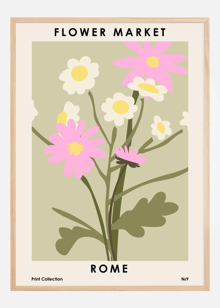 Със светъл и приветлив дизайн, този постер изобразява топлата и жизнена атмосфера на цветния пазар в Рим. Детайлността и игривото използване на цветове са в центъра на вниманието, с големи розови цветя, допълвани от деликатни бели цветя, всички на фон в успокояващ маслиненозелен нюанс. Тази щампа е идеална за придаване на усещането за вечния град Рим и неговата любов към красотата и природата във вашето пространство.