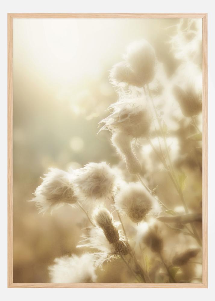 Магически плакат с пухкави цветя в ранната сутрешна светлина. Меките топчета на цветята са осветени от сутрешната светлина, която създава ангелски ореоли около всяко цвете. Меките пастелни цветове помагат да се създаде сънливо, магическо усещане за нежно събуждане.