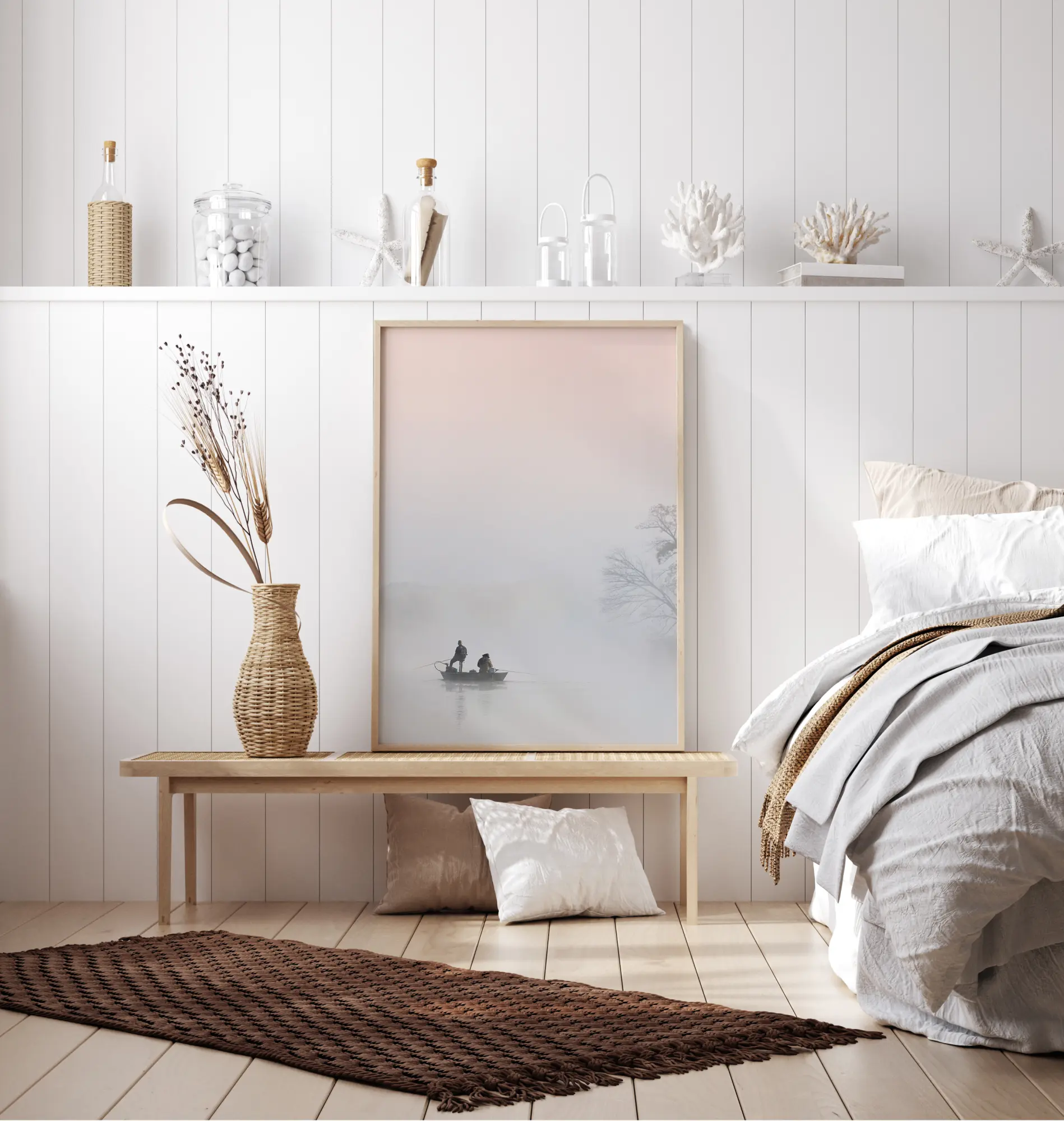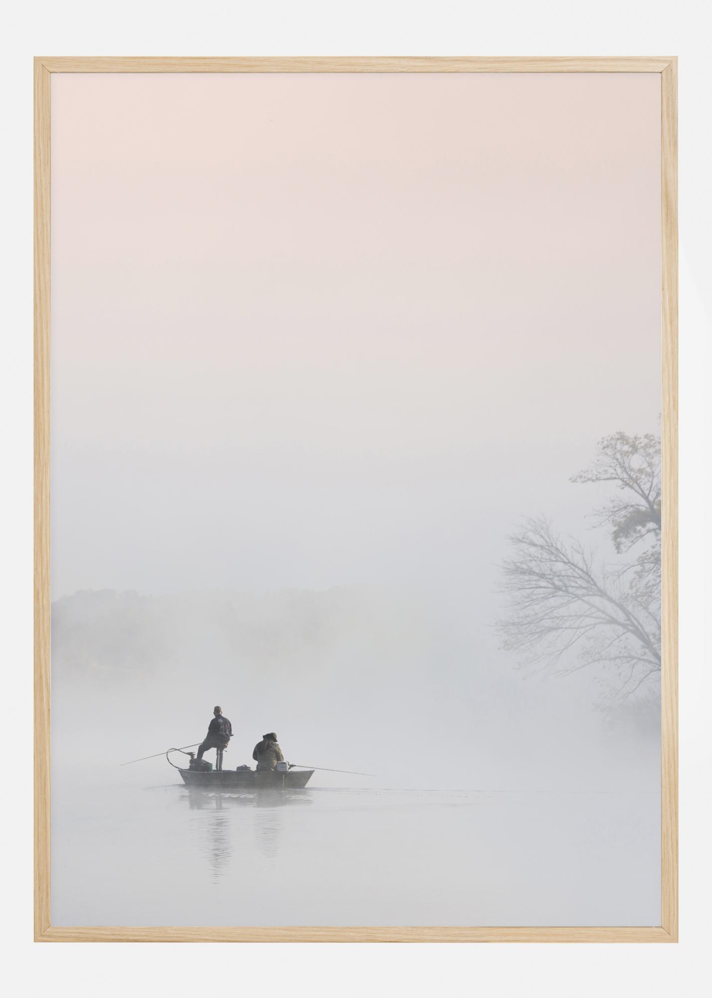 Магически плакат с двама мъже, които ловят риба в лодка в мъглива сутрин. Малката лодка се намира вляво в силует. Клоните на дърветата се виждат вдясно, но всичко е обвито в покривка от бяла мъгла, което прави това магическо изображение. Насладете се на спокойствието в ранната сутрин с този плакат.