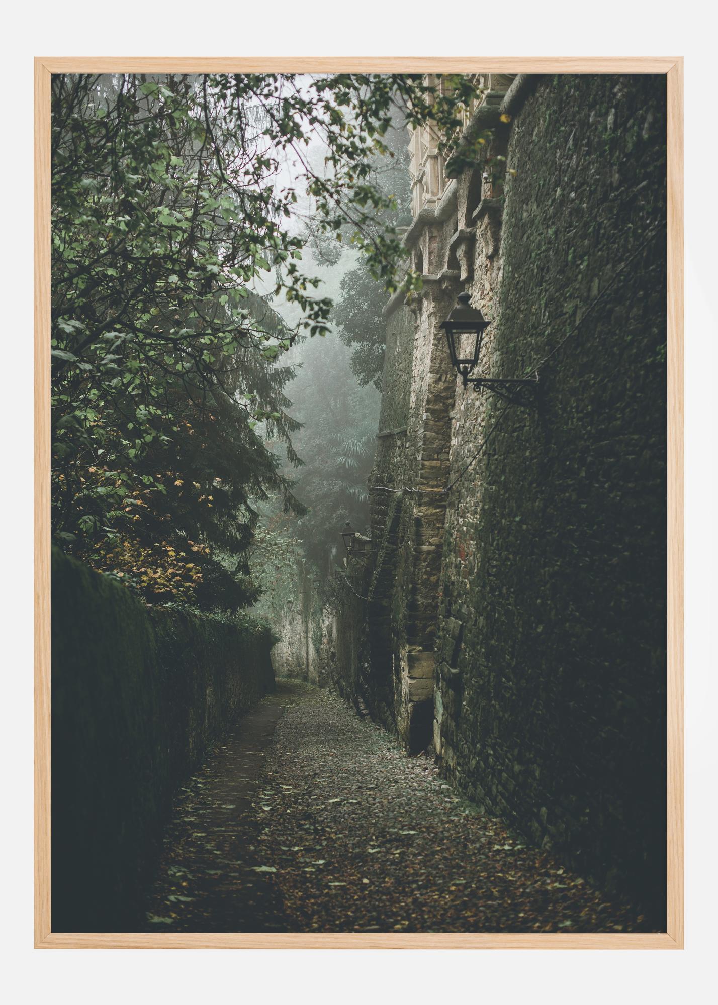 Този магически постер улавя мистична и омагьосана алея, обвита в мъгла и заобиколена от стените на историята. Алеята, обградена от мъхкана стена и зеленина, която спокойно виси надолу, създава усещане за навлизане в друг свят. Стара лампа, закрепена на каменната зидария на сградата, усилва историческото и романтичното усещане, което тази картина предава.