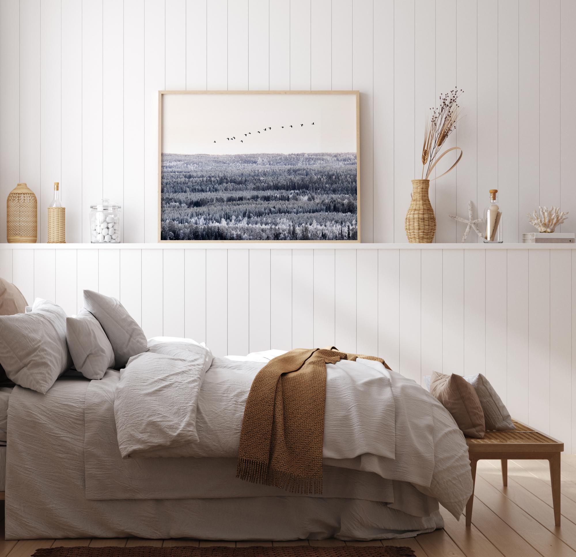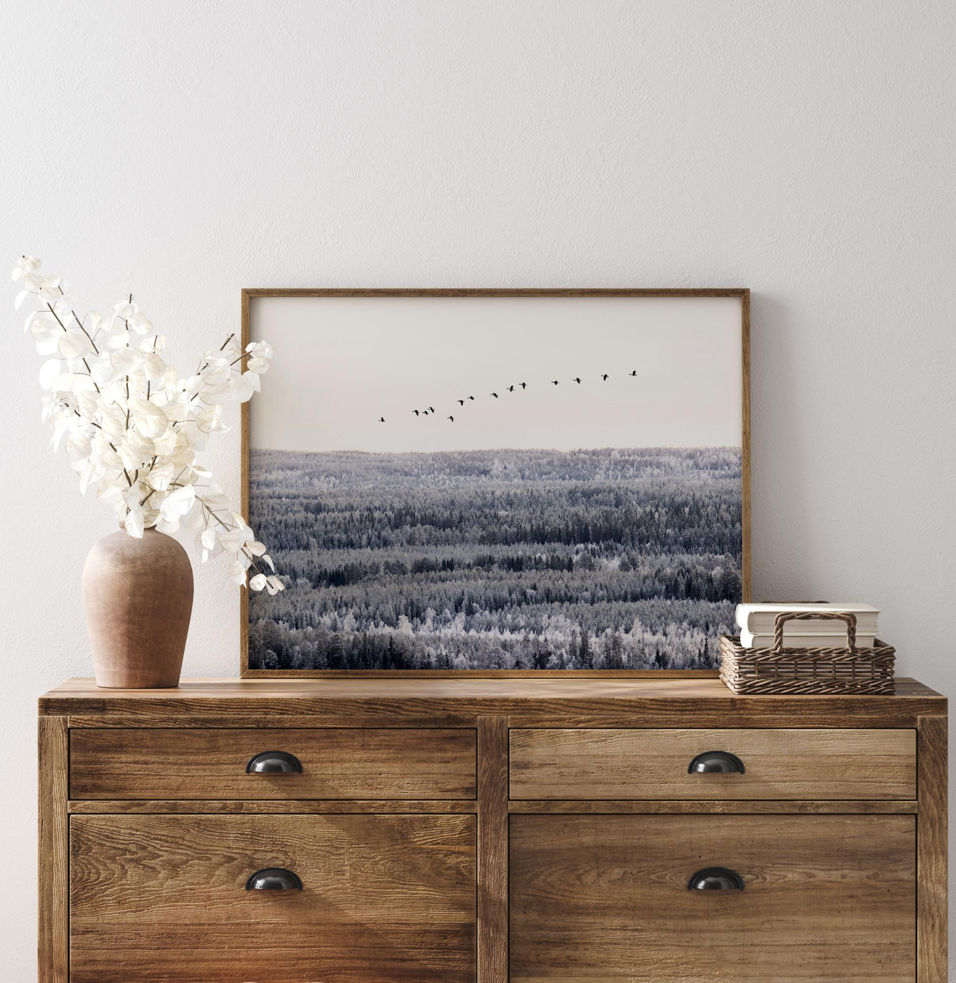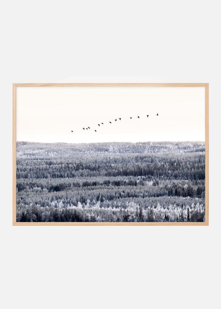 Фотографски постер на ято прелетни птици, които летят високо над върховете на дърветата. Широколистната гора е в свежи цветове под бяло небе. Постерът вдъхва прекрасно усещане за свобода.