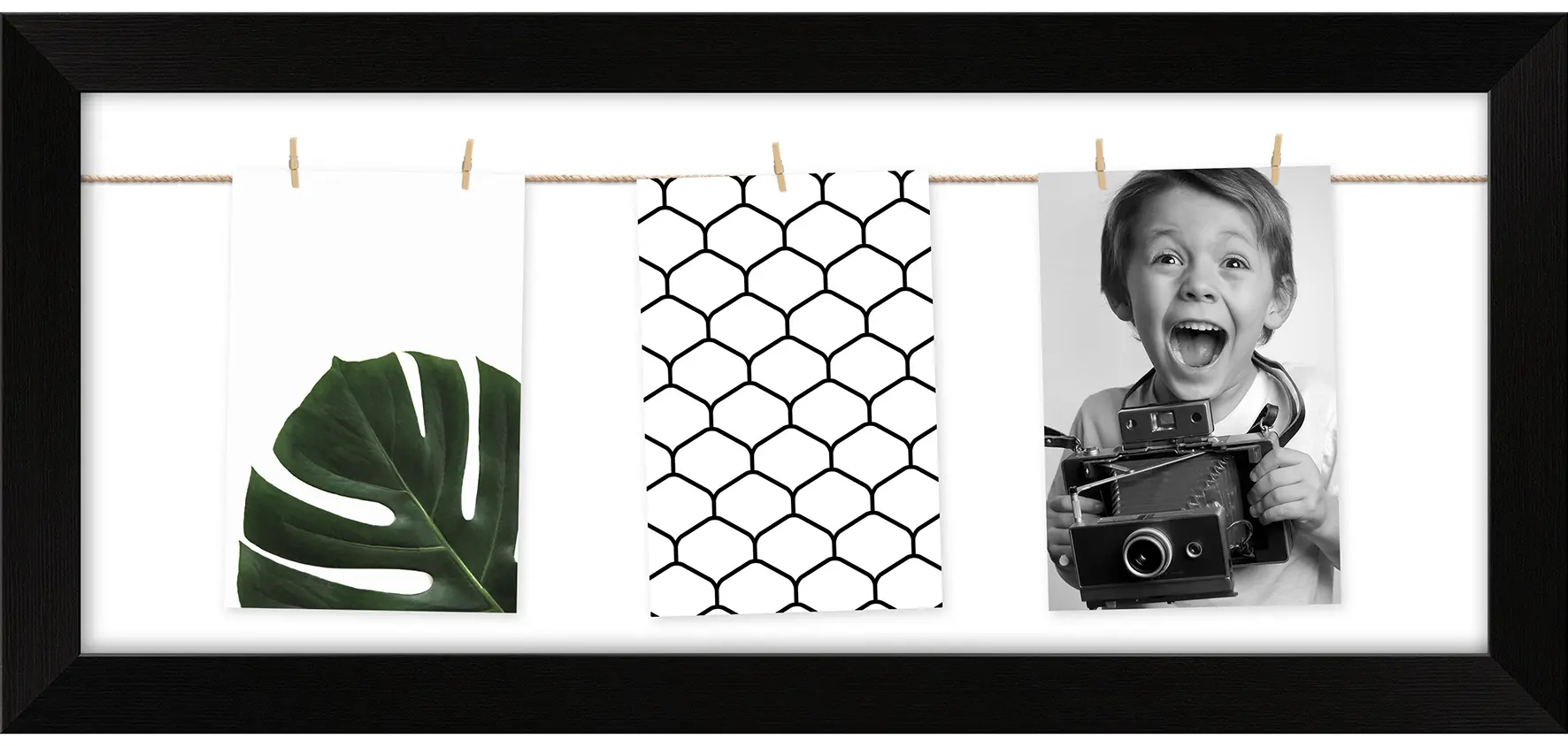 Рамката има отворен дизайн с две хоризонтални въжета, където лесно можете да прикрепите снимките си с помощта на приложените минищипки. Общо са включени 5 щипки, което прави лесно да сменяте и разнообразявате вашите снимки или илюстрации, според нуждите ви.