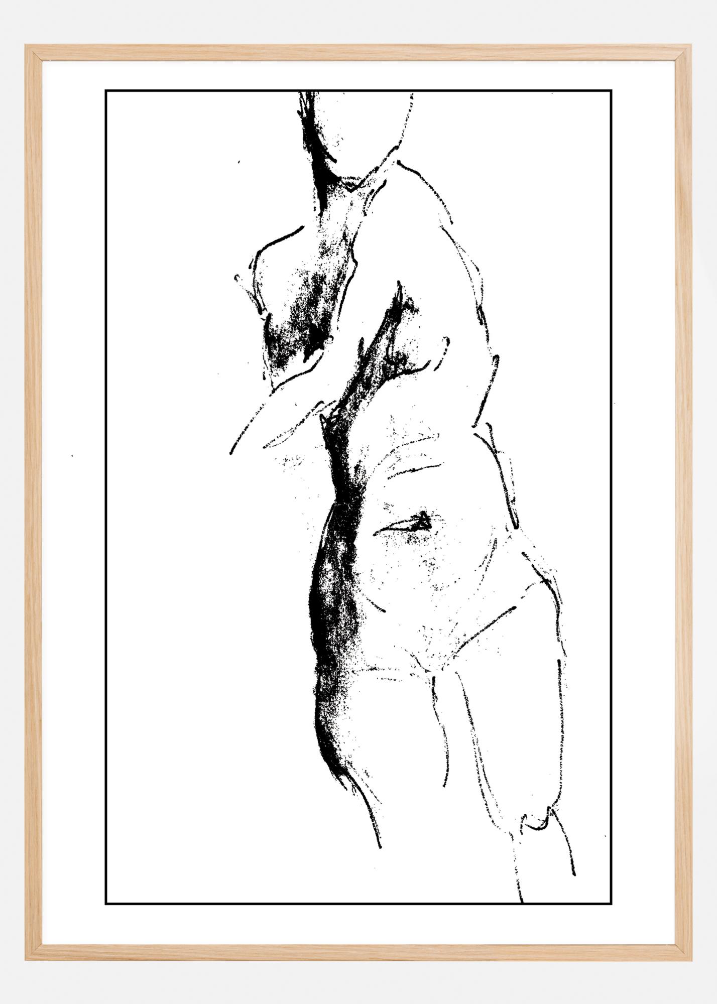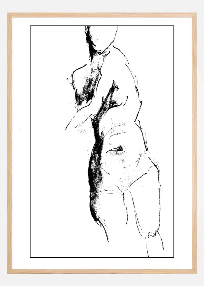Плакат с изображение на фигура с гола жена, която се обръща. Стилът на рисунката на тази картина помага да се създаде усещане за движение, когато моделът се обръща и пляска с ръце над гърдите. Този черно-бял принт ще изглежда страхотно на цветна стена.