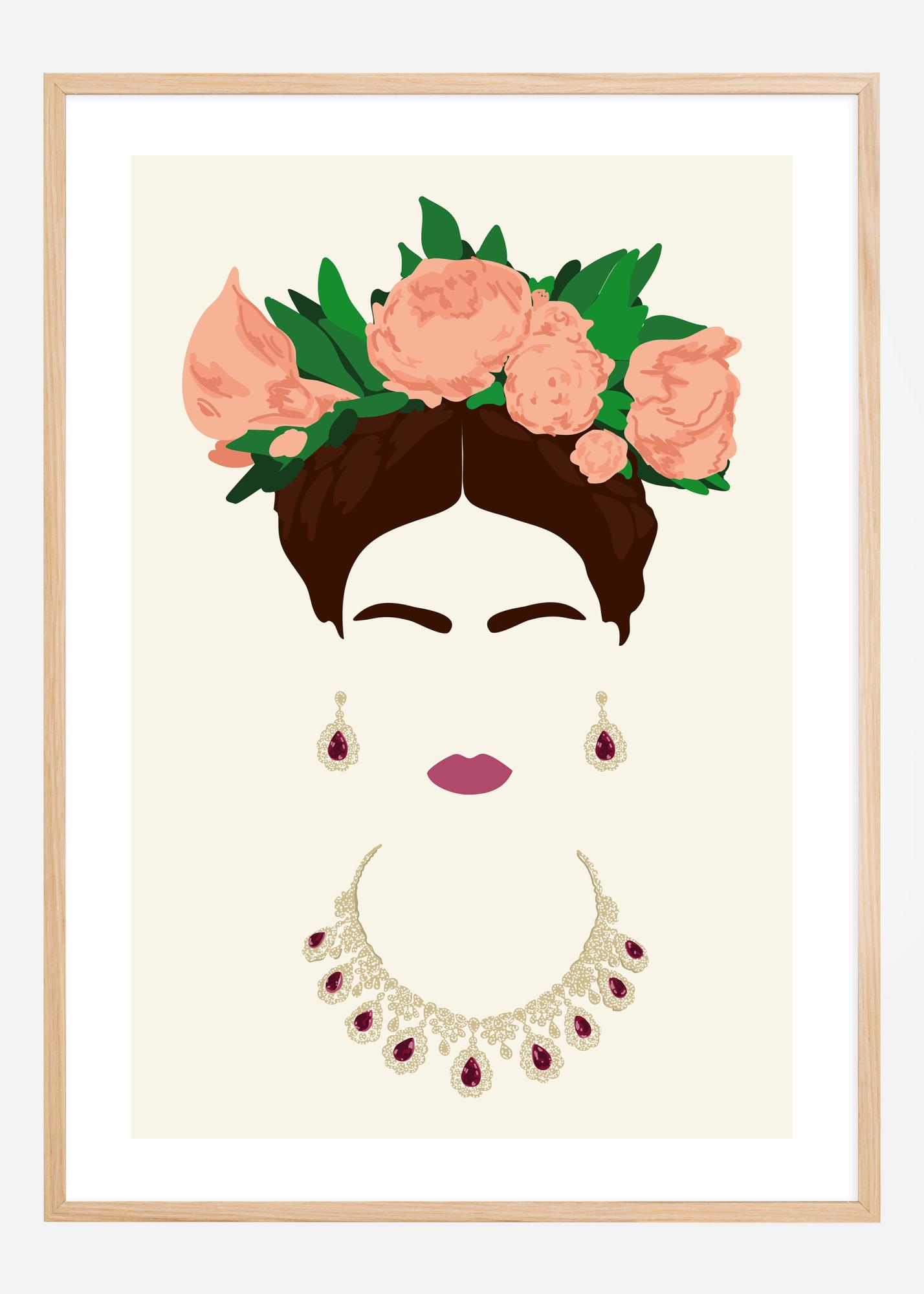 Този отличителен постер изобразява стилизирана женска фигура, украсена с богата флора и елегантни бижута. Мотивът представя хармонична композиция от тъмнокафява коса, кремообразна кожа и сияещ венец от коралово розови цветя, допълнени с тъмнозелени листа. Черти на нейното лице са сведени до минималистични форми, придаващи модерно усещане.