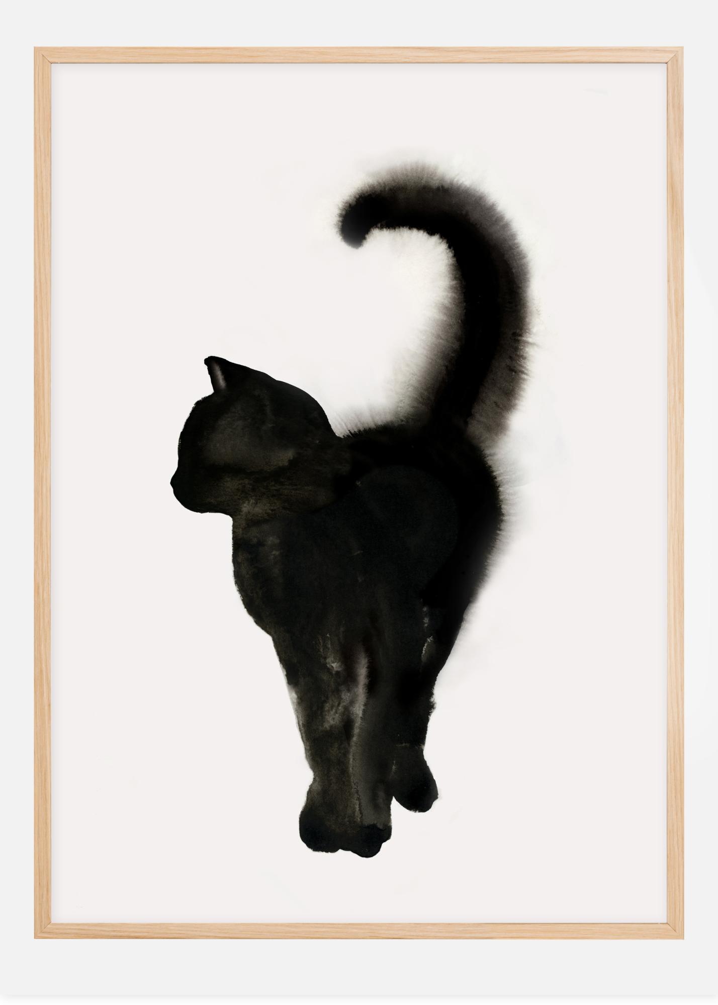 Плакат с животни с черно коте, което позира на бял фон. Черната котка стои с лапите събрани и гледа наляво с опашка в питаща извивка. Смес от твърди контури и меки четки придава на тази проста картина структура и я прави по-интересна, идеална за всяка стена.